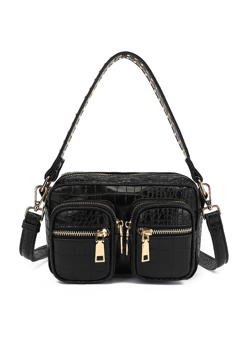 En super cool taske er landet her fra Noella. Denne taske er i det sejeste krokodille PU og med guldfarvede lynlås. Den har en lang rem og flere rum foran samt indeni!