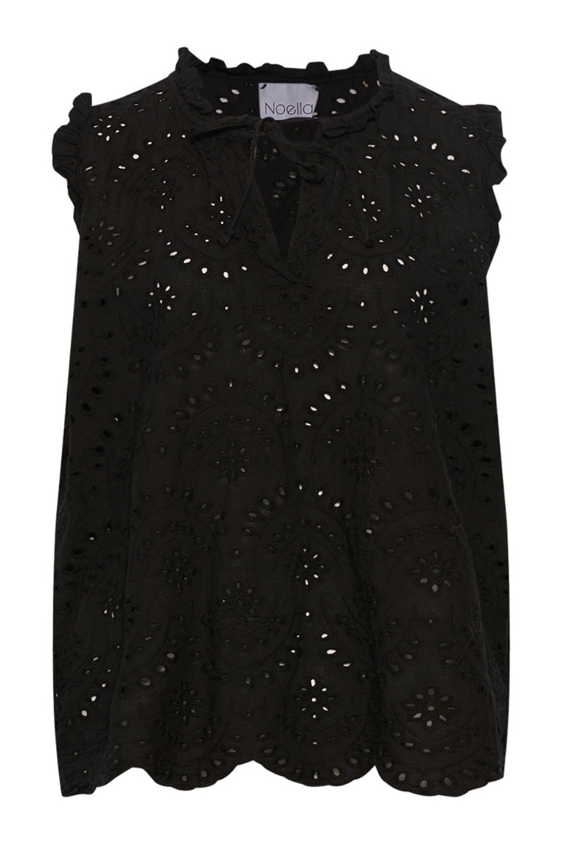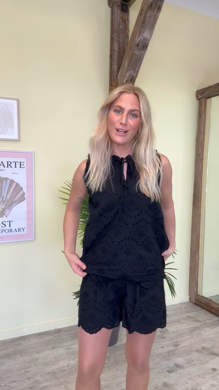 En fin top fra Noella i sort blonde kvalitet med fine sløjfe detaljer foran ved brystet. Den er en smule gennemsigtig og derfor anbefaler vi at du bruger en top under. Der findes et par matchende shorts til og hele sættet kan du også få i hvid.