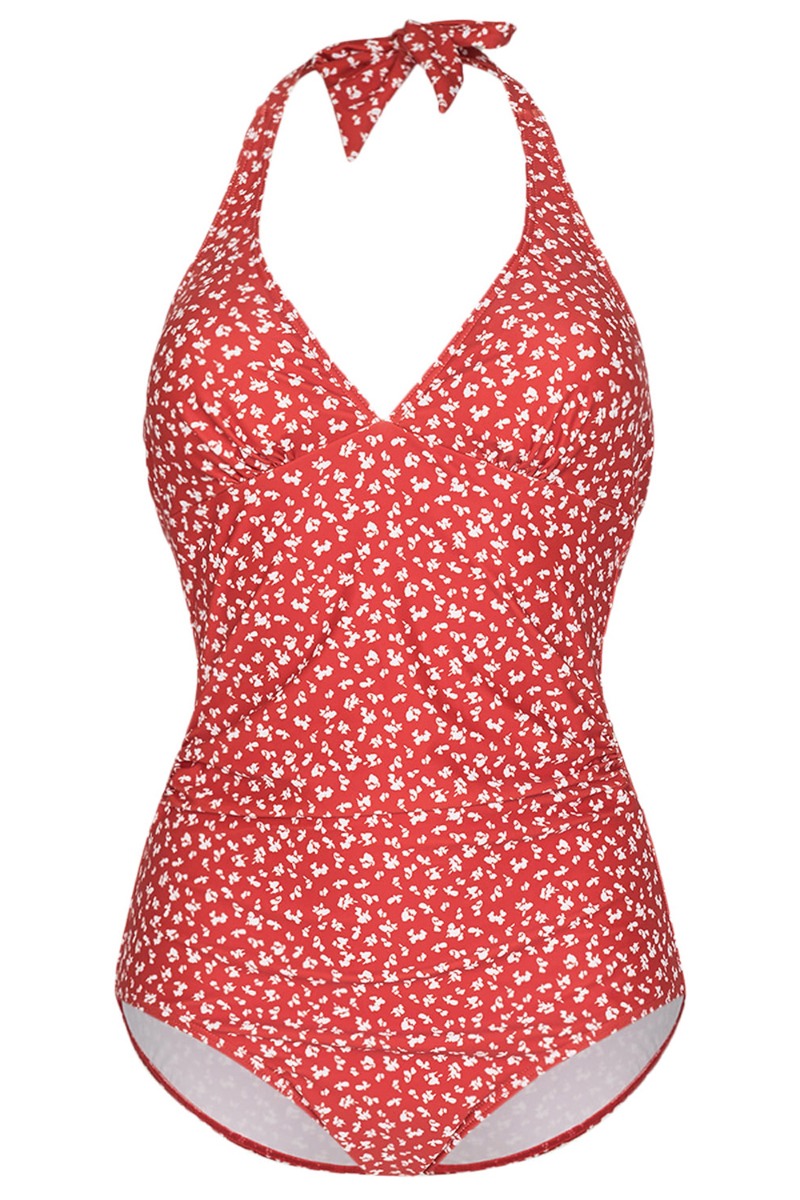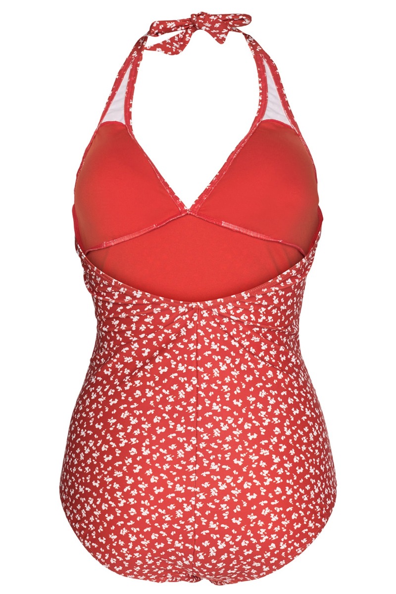 Flotteste røde badedragt med hvide blomster fra Nümph. Badedragte bindes i nakken og har vatterede skåle der kan tages ud. Badedragten er åben på ryggen og skæres lige under brystet. Der er lavet en smule rynke-effekt i siderne der giver en super flot pasform.