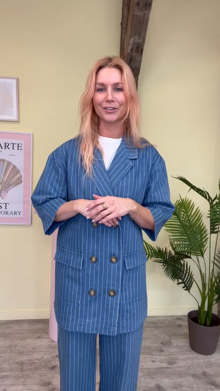 En sej blazer er kommet med korte ærmer fra Nümph i en let denim kvalitet. Den er løs i pasformen og lukkes foran med to rækker knapper. Derudover er den lang i modellen og de korte ærmer giver dette sommer look. Der findes et par matchende bukser til.