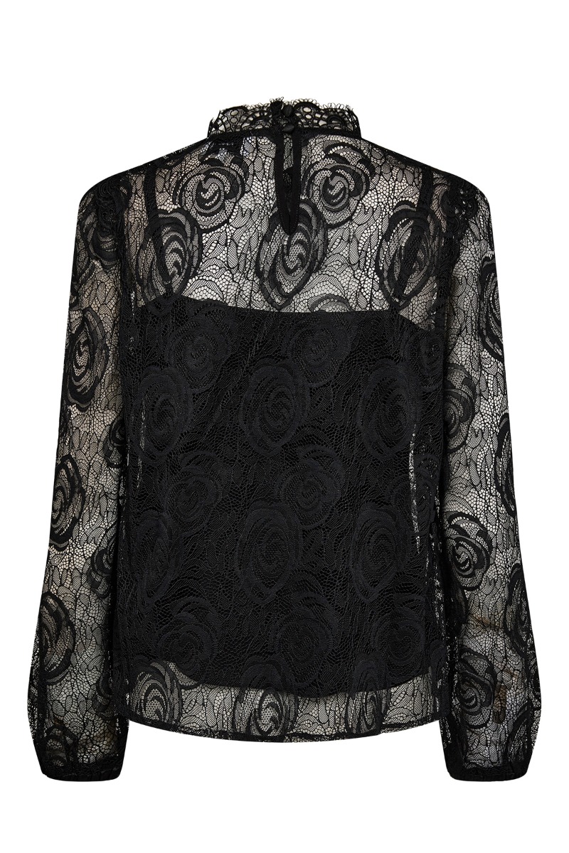 En smuk bluse fra Nümph i et feminint design. Blusen er designet i et blondestof med fine detaljer. Den har lidt højde på halsen og er transparent på ærmerne. En virkelig flot bluse at bruge både til et par jeans, eller evt. en nederdel for et mere festligt look.