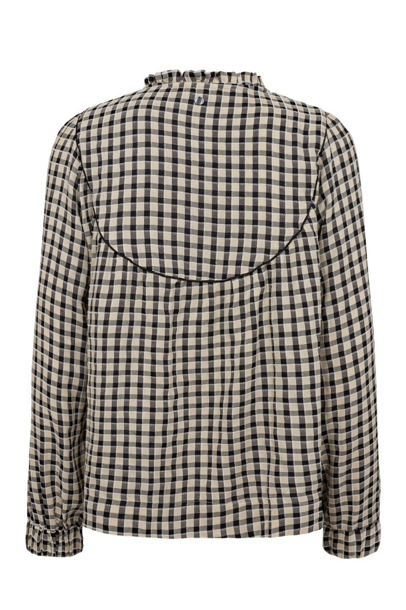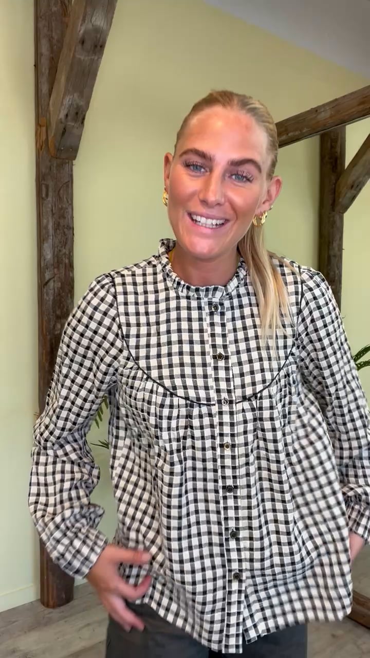 En super sød bluse fra Nümph. Blusen har et ternet print i hvid, navy og lysergule farvenuancer. Den har knaplukning, som er designet som små blomster. Blusen har elastik ved håndledene og er let i kvaliteten.