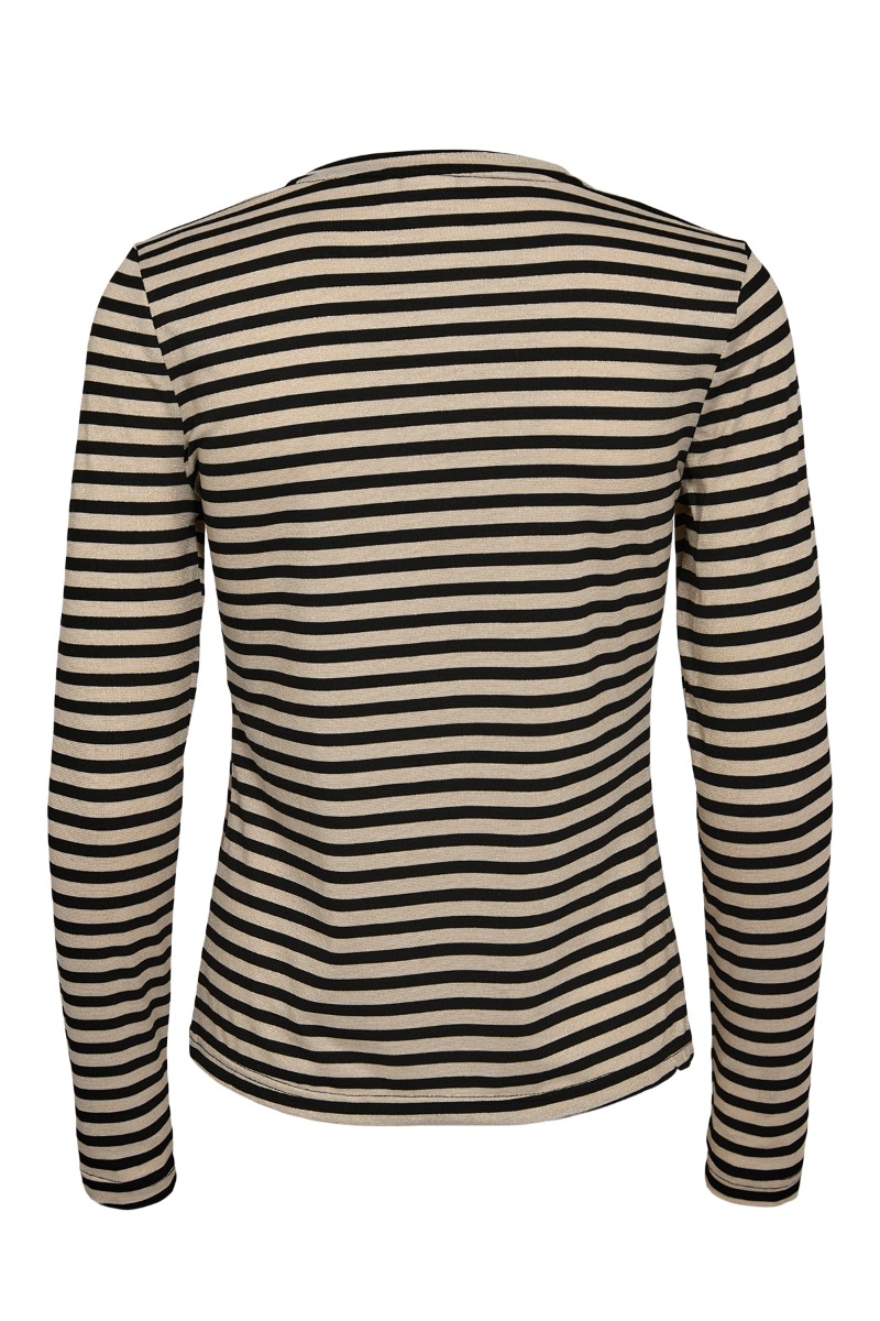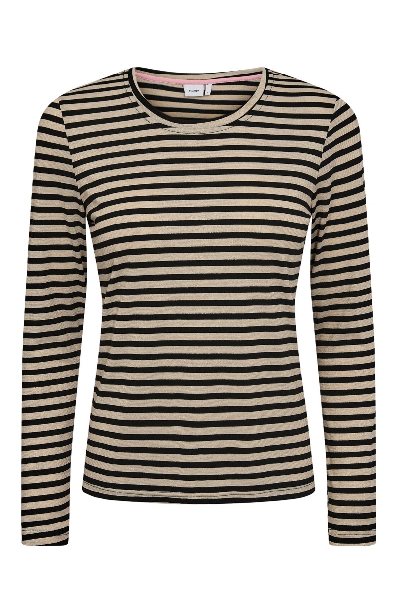 Fin bluse med guld glimmer fra Nümph. En ellers klassisk bluse, men denne har glimmer i den guldfarvede stribe. Det giver et fint touch og pifter blusen op. Brug den til hverdag med et par jeans og en blazer, eller til en nederdel for at gøre der mere festligt.