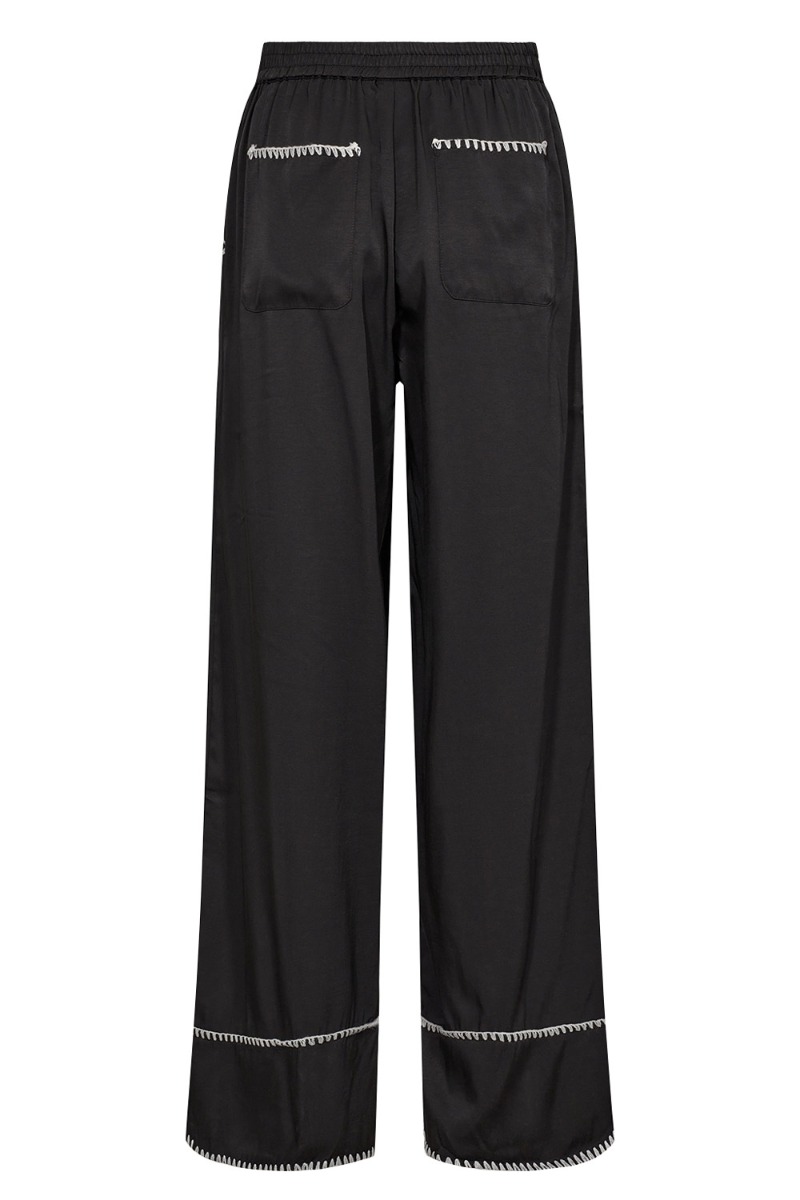 Et par seje bukser fra Nümph er kommet i sort med cool detaljer ved kanterne ved bund og lommer i kontrast farve. De er med elastik i tlajen og har vide i benene. Kvaliteten er dejlig let og nem at bruge også har til sommer. Der findes en matchende overdel.