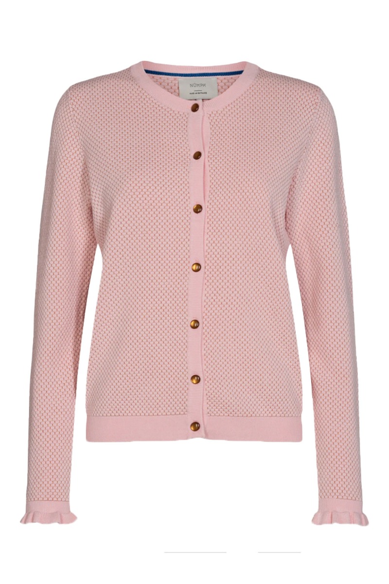 Lyserød cardigan med knapper fra Nümph. Cardiganen har en lille tynd guld strål i det præget mønster, der giver en sød diskret glimmereffekt. De lange ærmer har en sød flæsekant ved håndleddet og kan styles over dine kjoler og t-shirts.