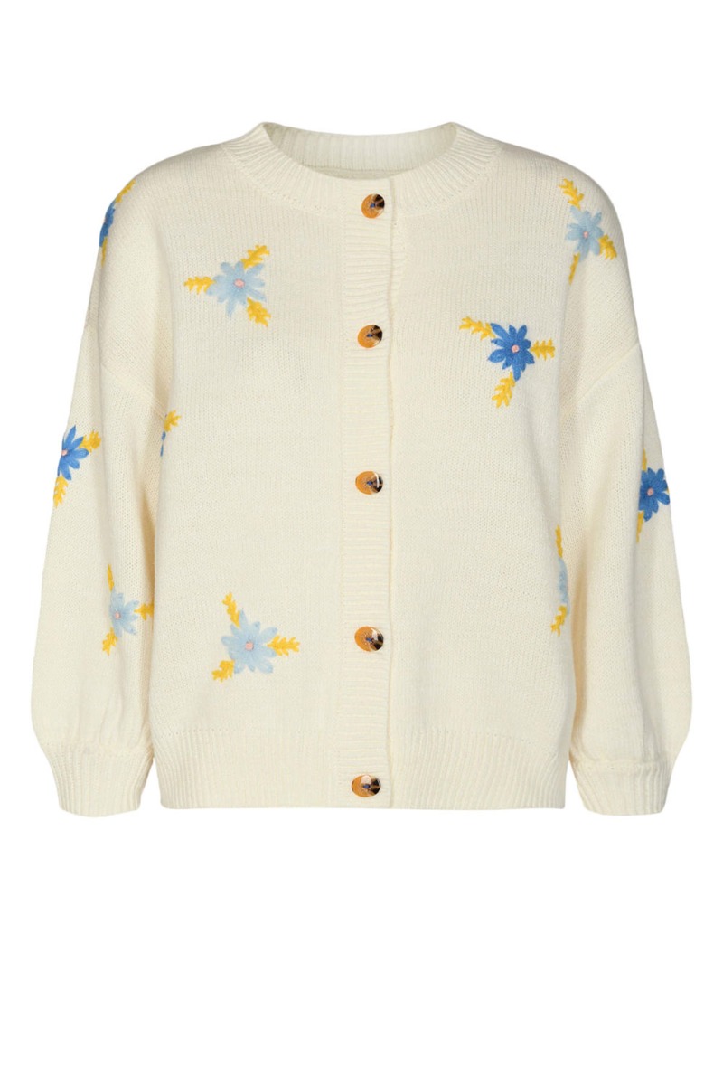 En rigtig sød og dejlig strik cardigan fra Nümph cropped ærmer og rund hals. Den er hvid med et sødt lille broderet blomsterprint i blå og gule farver. Den er super blød at have på og kan bruges alene lukket eller over dine overdele.