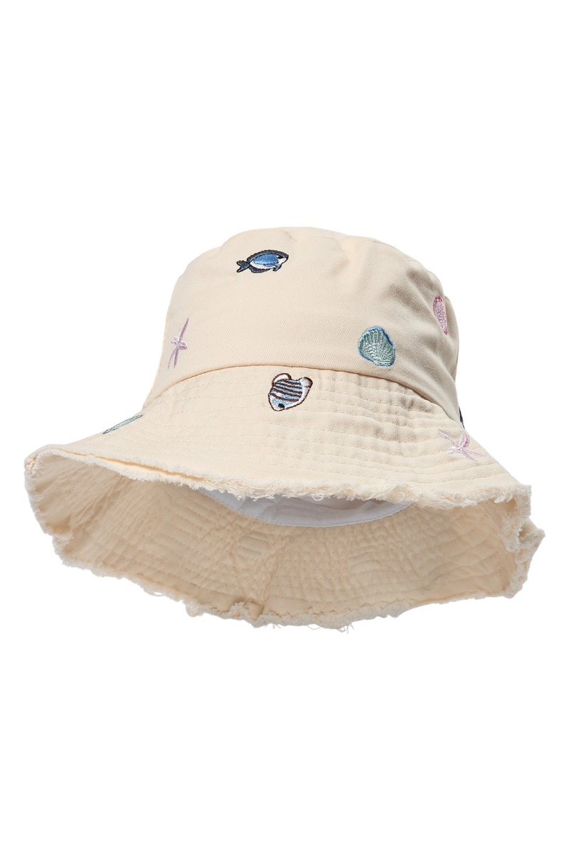 Denne fine bøllehat har et afslappet, sommerligt look med et lille twist. Den er lavet i en lys, sandfarvet kvalitet og pyntet med små broderede motiver som fisk, muslingeskaller og dragonflies, der giver et legende og maritimt udtryk. Skyggen er bred og blød med en let rå/”frayed” kant, som gør den ekstra cool og casual. Perfekt til strandture, feriedage og solrige hverdage, hvor du både vil have lidt skygge og et sødt statement-accessory.
