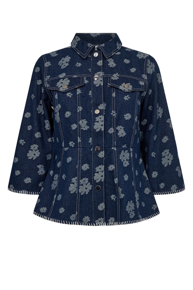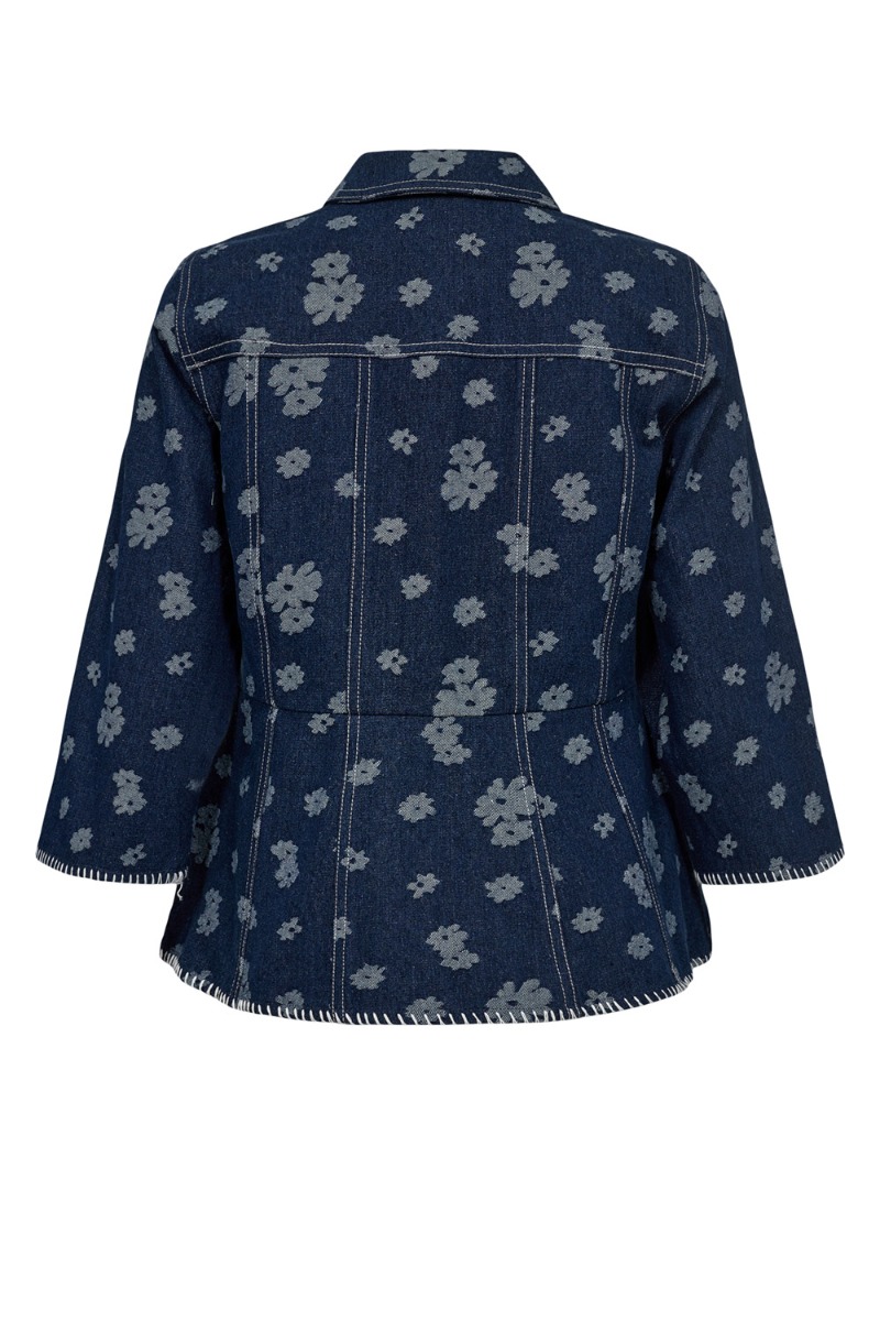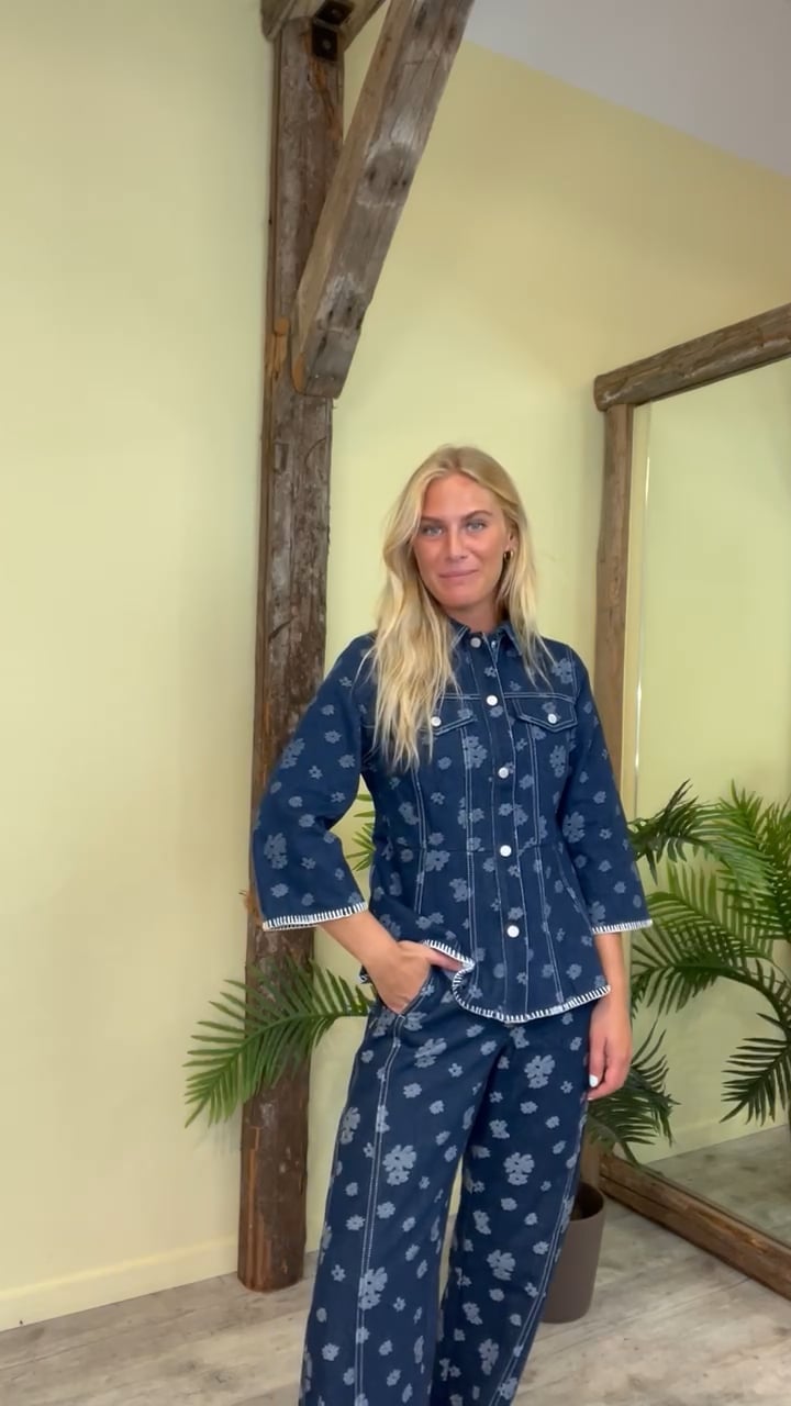 En smuk jakke fra Nümph i en mørk denim farve med blomster print en lys denim farve. Den er figursyet og giver derfor denne smalle talje. Derudover findes der en matchende underdel til og du kan derfor nemt lave et sæt. En nem style til hverdag med et par short eller jeans.