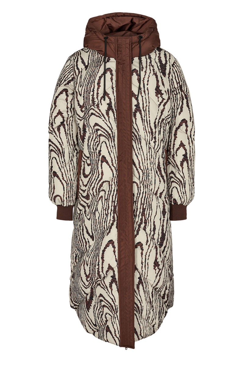 Den sejeste jakke fra Nümph i brune nuancer. Jakken er lang og i en lækker puf kvalitet. Derudover har den en god stor monteret hætte og dybe foret skrålommer. Den er lilla på indersiden og kan knappes op bagpå så den får en slids. Jakken lukkes med lynlås samt sknaplukning foran.