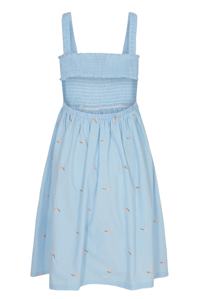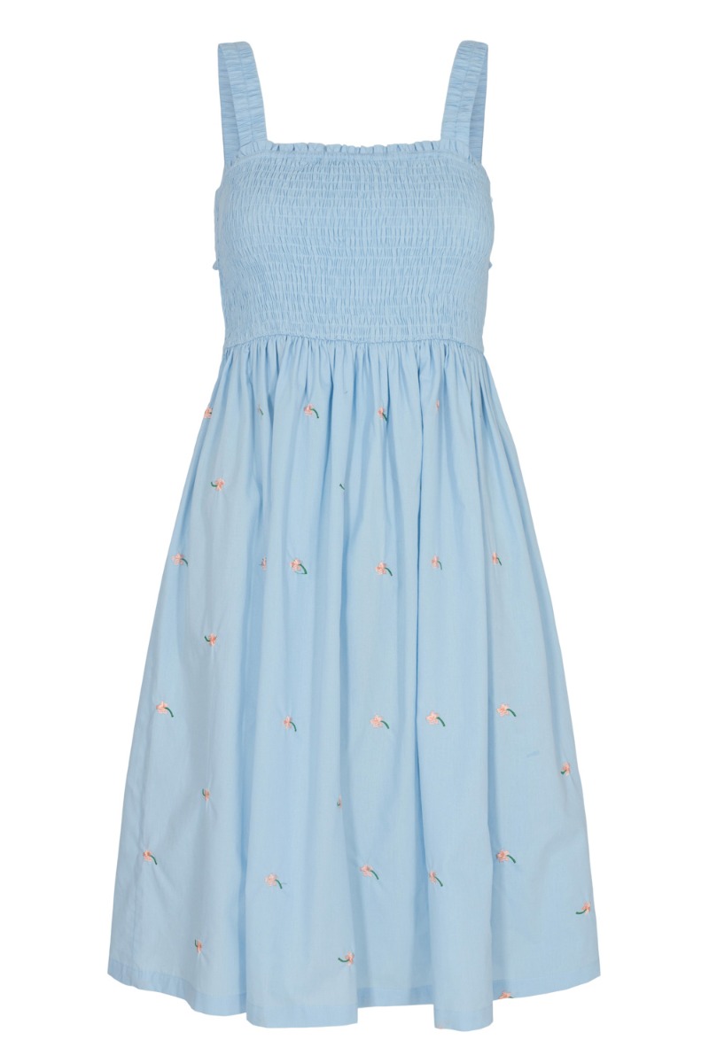 Smukkeste smock kjole med søde detaljer fra Nümph. Hold nu op hvor er denne her kjole bare helt unik... på den fede måde! Kjolen har brede stropper, som holder kjolen oppe. Det øverste stykke af kjolen er i smock med bar ryg og en bredt smockelastik som giver en smuk rygdetalje. Nederste del af kjolen er et løst stykke som giver en nederdelseffekt og er med til at give den bedste pasform. Der er små blomster på hele det nederste stykke.