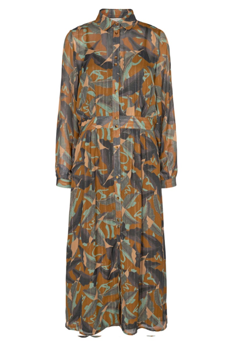 En rigtig smuk feminin kjole fra Nümph i et efterårsprint. Kjolen er lavet i et transparent materiale, der har medfølgende underkjole. Foran lukkes den med knapper hele vejen ned og har et fast stykke ved livet der giver en smuk feminin talje. Style den med en stilet til de kommende efterårsfester.