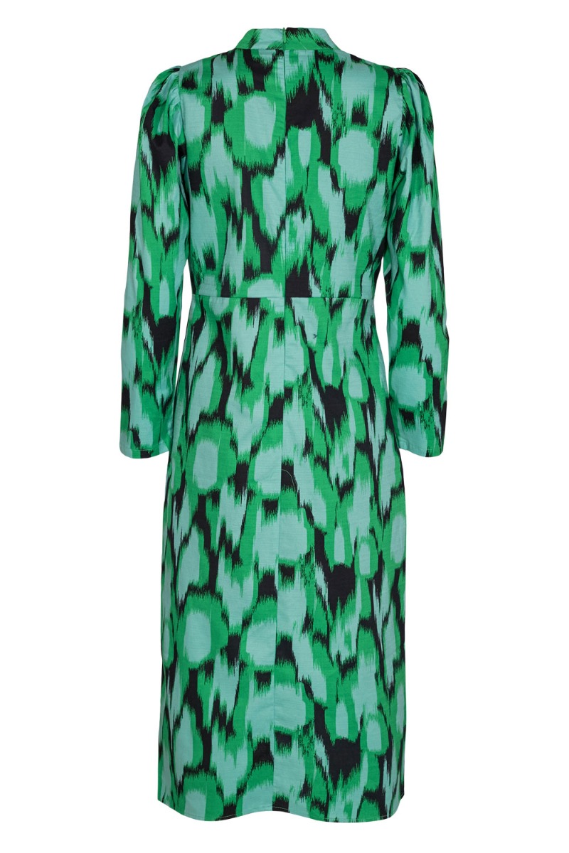 En virkelig smuk feminin kjole fra Nümph i den dejligste grønne nuancer med et sort og blåt grafisk print. Kjolen er lang med en lille o-neck der lukkes bagpå med lynlås. Kjolen har en utrolig smuk pasform med en tydelig syning i livet der skaber en feminin talje, samt et lille pufærme.