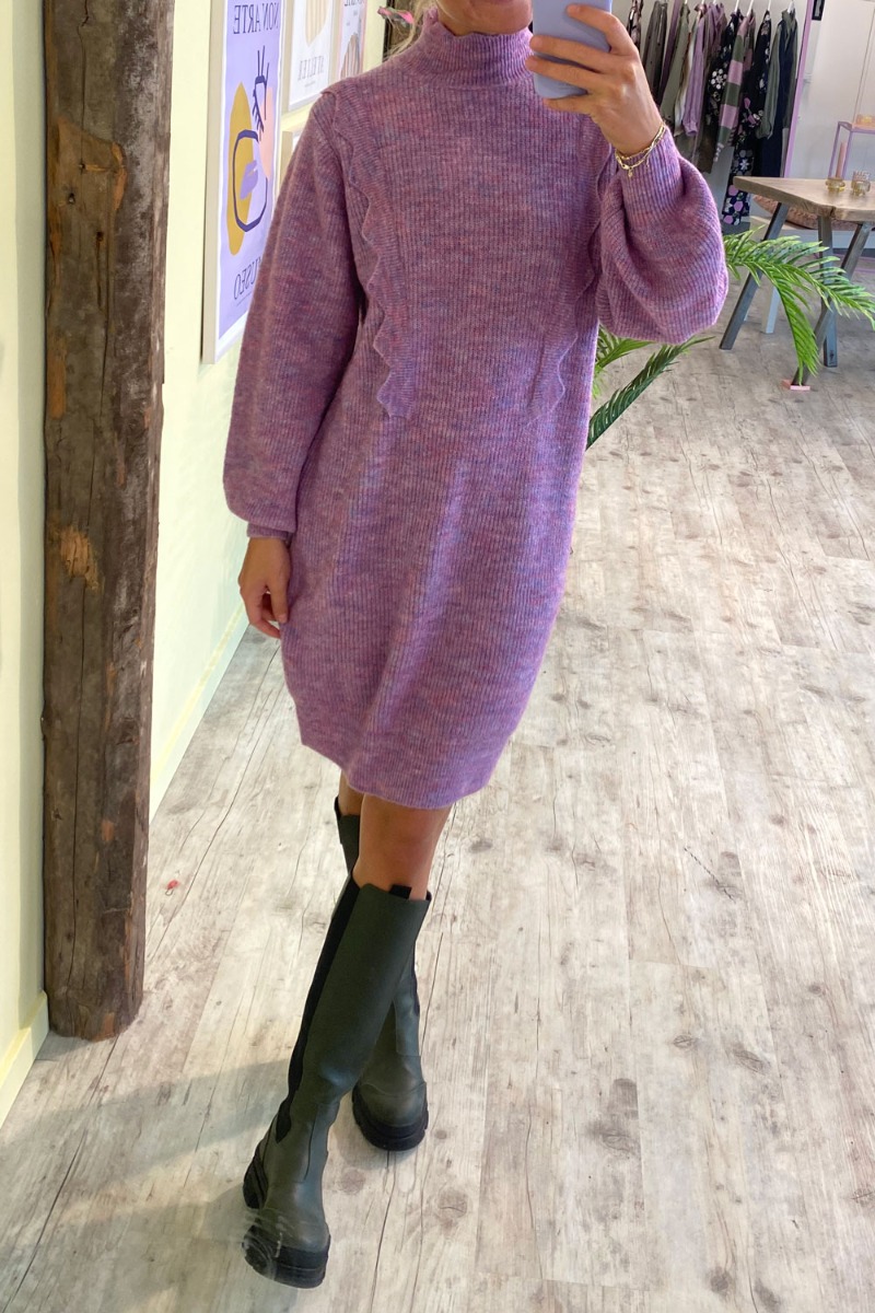 Smuk lilla strikkjole fra Nümph. Strikken har o-neck med en sød flæsedetalje foran ved brystet. Den går til knæet og er super cool at style med en støvle til efteråret.