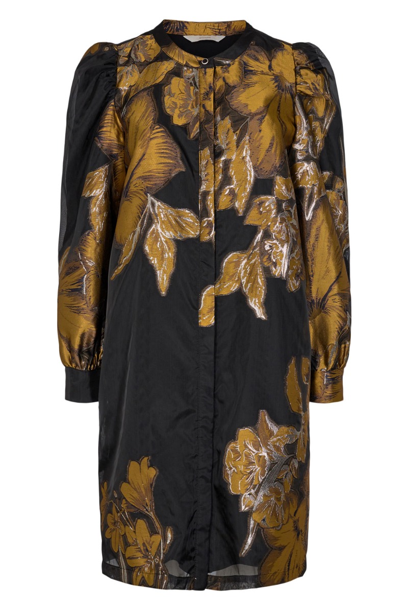 Nu kan du endelig blive klar til alle de mange julefrokoster der starter! Denne kjole fra Nümph er helt sikkert et oplagt valg. Den er sort med det fineste blomsterprint i gul med små sølvdetaljer. Foran lukkes den med skjult knaplukning og har et lille pufærme. Kjolen er lavet i et transparent materiale der er foret indvendigt og super smuk med en stilet.