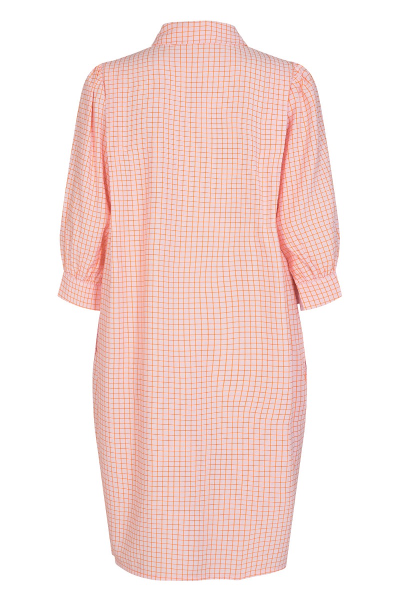 Denne kjole fra Nümph giver masser af SOMMER-VIBE i den skønneste farvekombination. Kjolen er lyserød med orange ternet mønster. Den er lavet i en skøn behagelig kvalitet med skjortekrave og stofbetrukket knapper hele vejen ned der gør den ammevenlig. De 3/4 lange ærmer afsluttes med et fast stykke og to knapper.