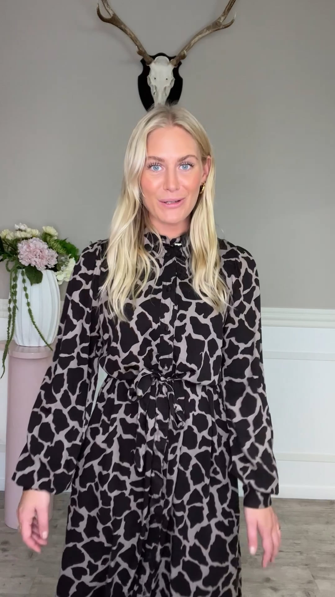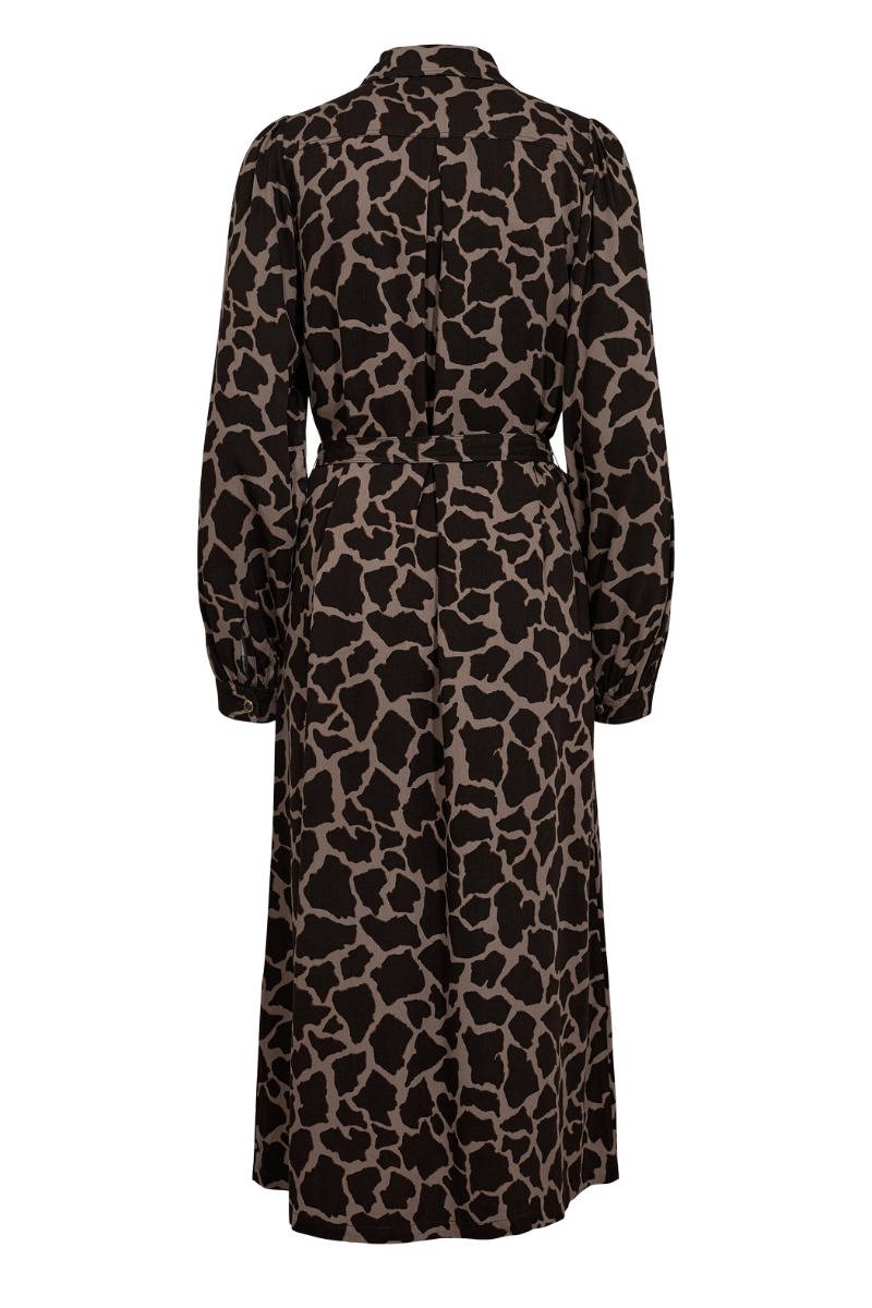Lang kjole fra Nümph. Denne kjole har en sort baggrundsfarve med et krakeleret mønster i en flot brunlig nuance. Kjolen er lang, har lange ærmer og snørres i taljen, som fremhæver en feminin silhuet. Det er en kjole som sagtens både kan bruges til hverdag samt festlige anledninger.