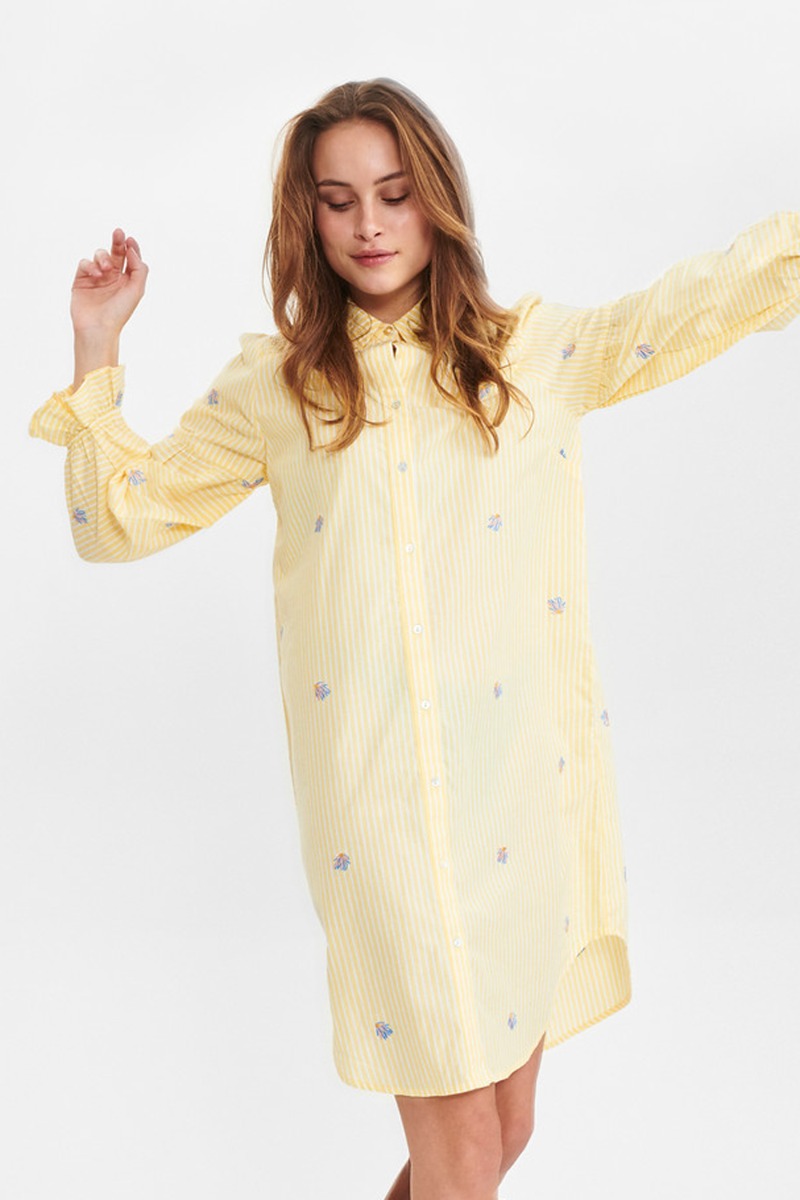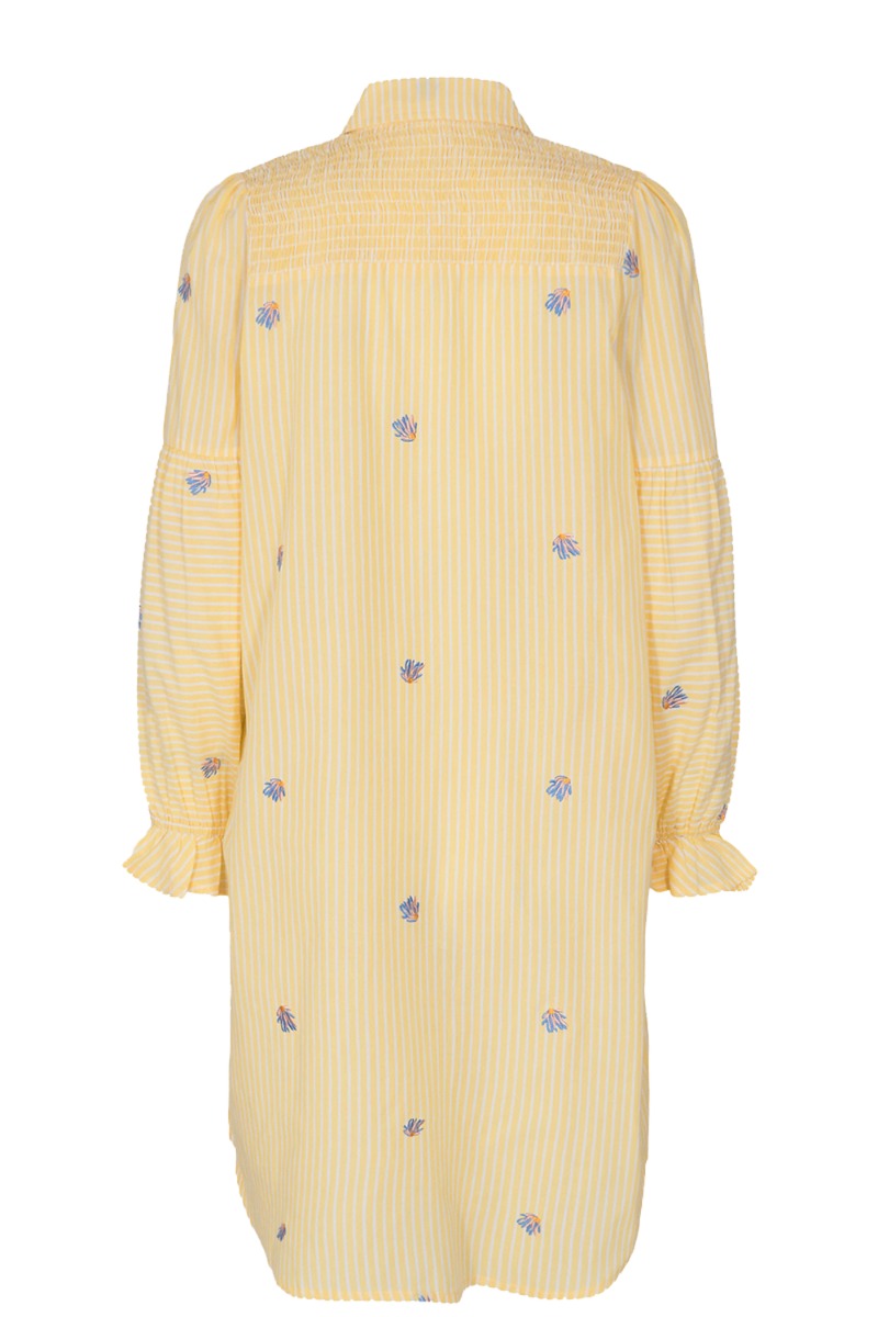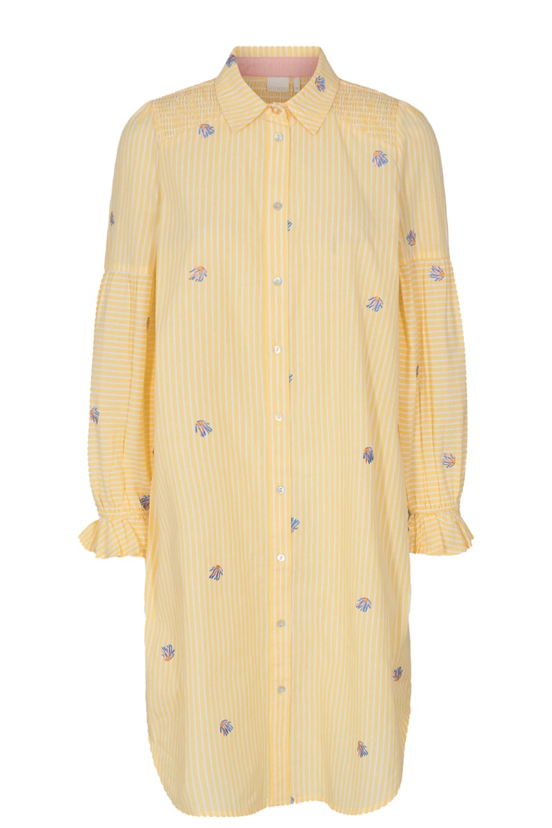 Denne her har vi altså glædet os til skulle lande! Det er simpelthen den fineste kjole fra Nümph med masser er detaljer. Kjolen er lysegul med hvide striber med smukke broderede blomster. De lange ærmer afsluttes med en flæsekant der sammen med den lille perlemorsknap ved kraven giver kjolen sit feminine udtryk. Kjolen er knælang og kan sagtens styles som den er eller over et par jeans.