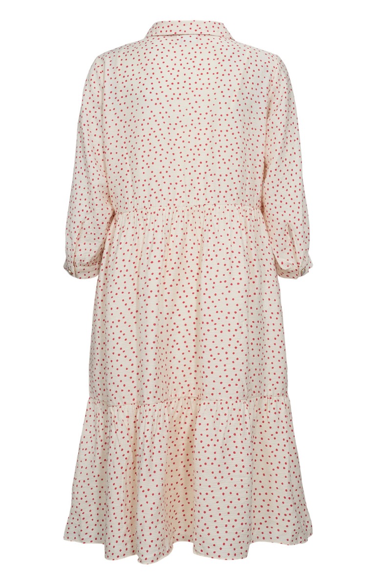 Denne smukke kjole er fra Nümph og perfekt til foråret og sommeren som ligger lige om hjørnet. Den er løs i pasformen og er med aftagelig underkjole. Derudover giver den hvid farver sammen med de små røde prikker et smukt og let sommerligt udtryk. Den er med knapper foran og ned til brystet samt ærmer i 3/4 længde.