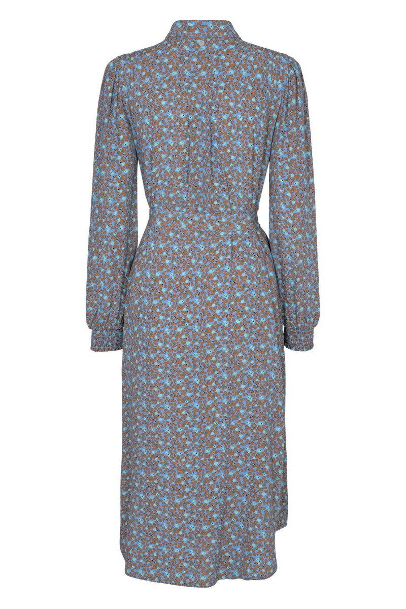 Smuk feminin kjole fra Nümph med blå baggrund og et fint grafisk mønster i brunt. Kjolen har gennemgående knapper hele vejen ned og medfølgende bindebånd til at skabe en feminin talje. De lange ærmer afsluttes med en smockeffekt der gør det anvendeligt at sætte ærmet som du ønsker.