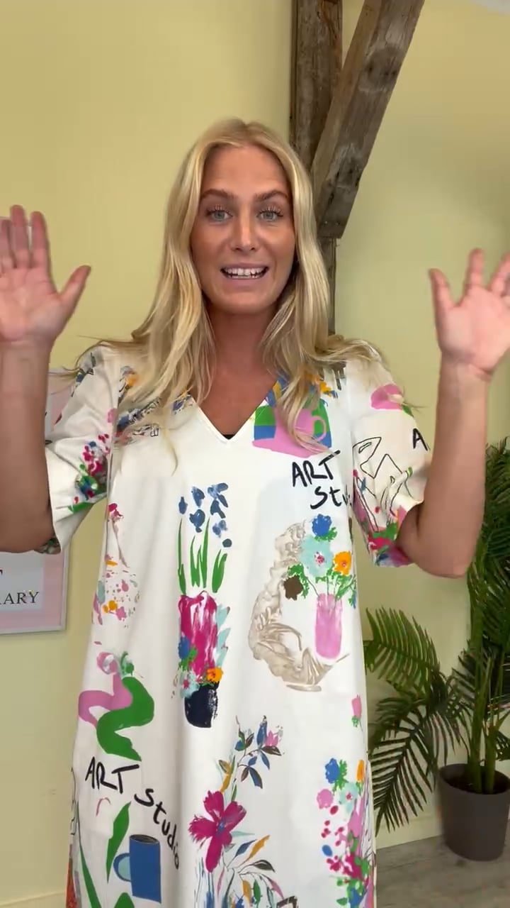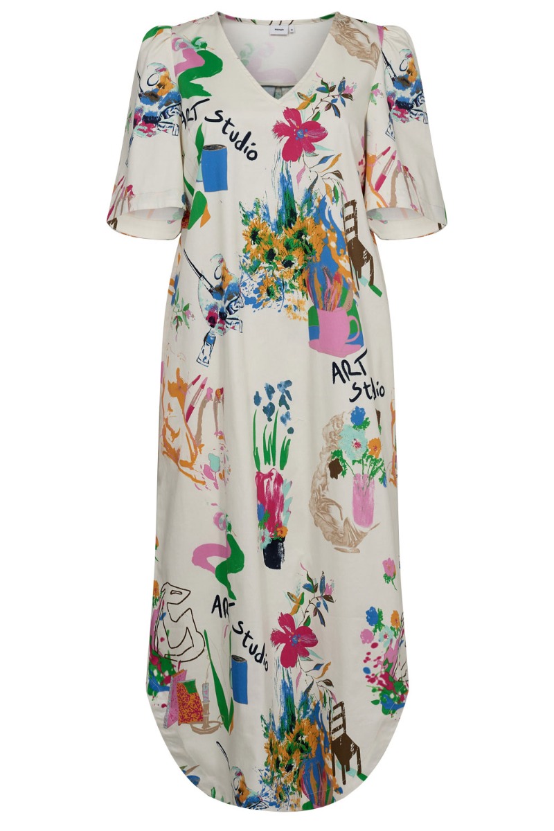 En fin kjole fra Nümph er kommet i et farverigt grafisk "Art Studio" print. Den er i en løs pasform og har korte ærmer samt v hals. Den er perfekt til sommer med en lille sandal eller til fest med stiletter. Der er lommer i begge sider som sidder lige syningen derfor er den heller ikke så synlig.