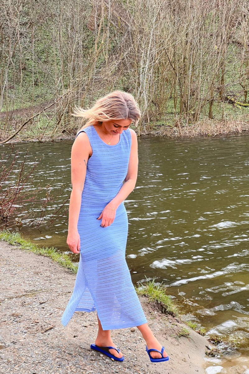 Denne kjole er så smuk i farven og er i en lette strik kvalitet. Der er med underkjole og er der for ikke gennemsigtig. Derudover er den med slids i bunden i begge sider og den lukkes i nakken med en lille knap. Kjolen er fra Nümph og der har lavet et hav af smukke festkjoler.