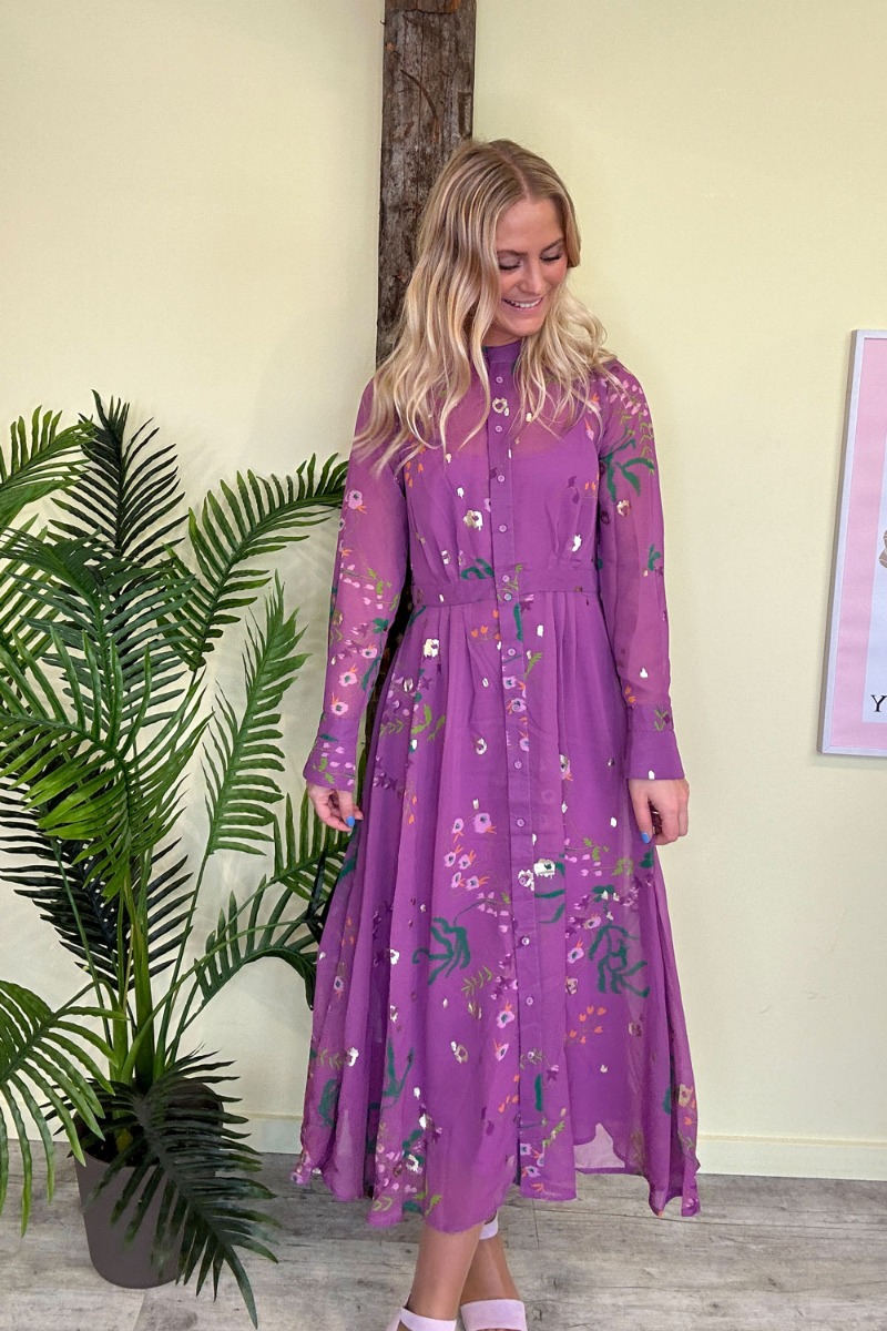 Den smukkeste kjole er kommet i en ny skøn lille farve med blomsterprint fra Nümph. Den er i to lag med et let yderlag som er kan knappes ned fra top til bund. Deruodver er den i en dejlig let kvalitet som falder så smukt ved bevægelse. Underkjolen er ligeså lang som yderlaget og derfor for du en smuk afslutning på kjolen. Den findes i flere farver og mønstre.