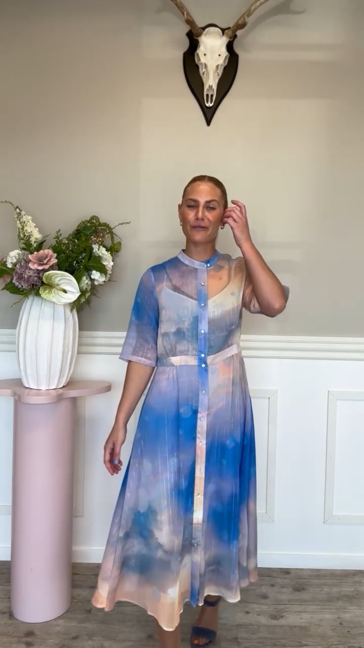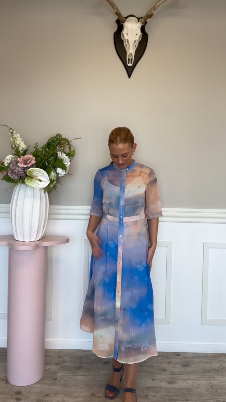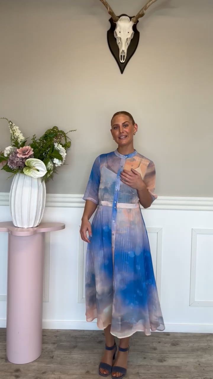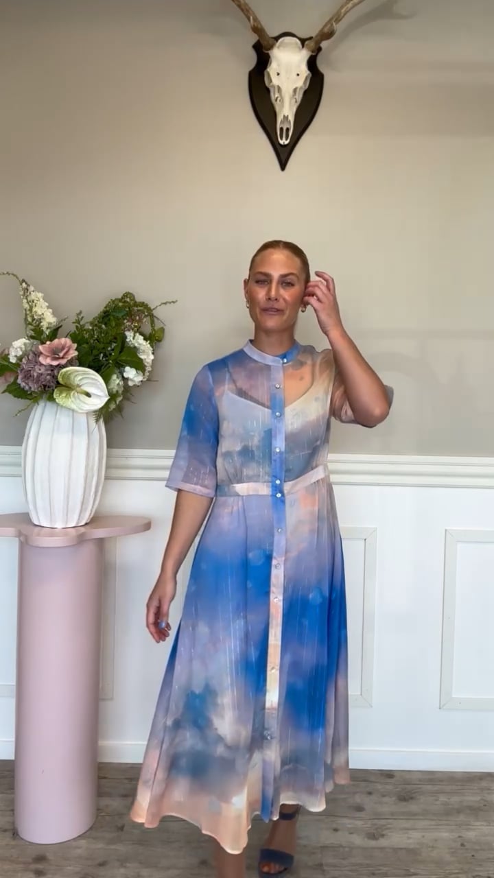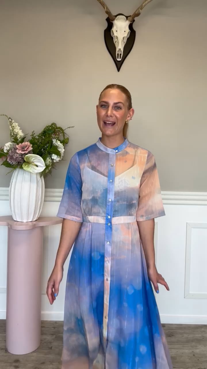 Den smukkeste kjole fra Nümph er landet til dette forår! Kjolen er designet i den lækreste kvalitet, med fine farver som giver en "himmel-effekt". Den har korte ærmer og falder pænt langs kroppen. En fin kjole at bruge til forårets og sommerens fester og andre anledninger. Man kan også nemt have den på til hverdag.