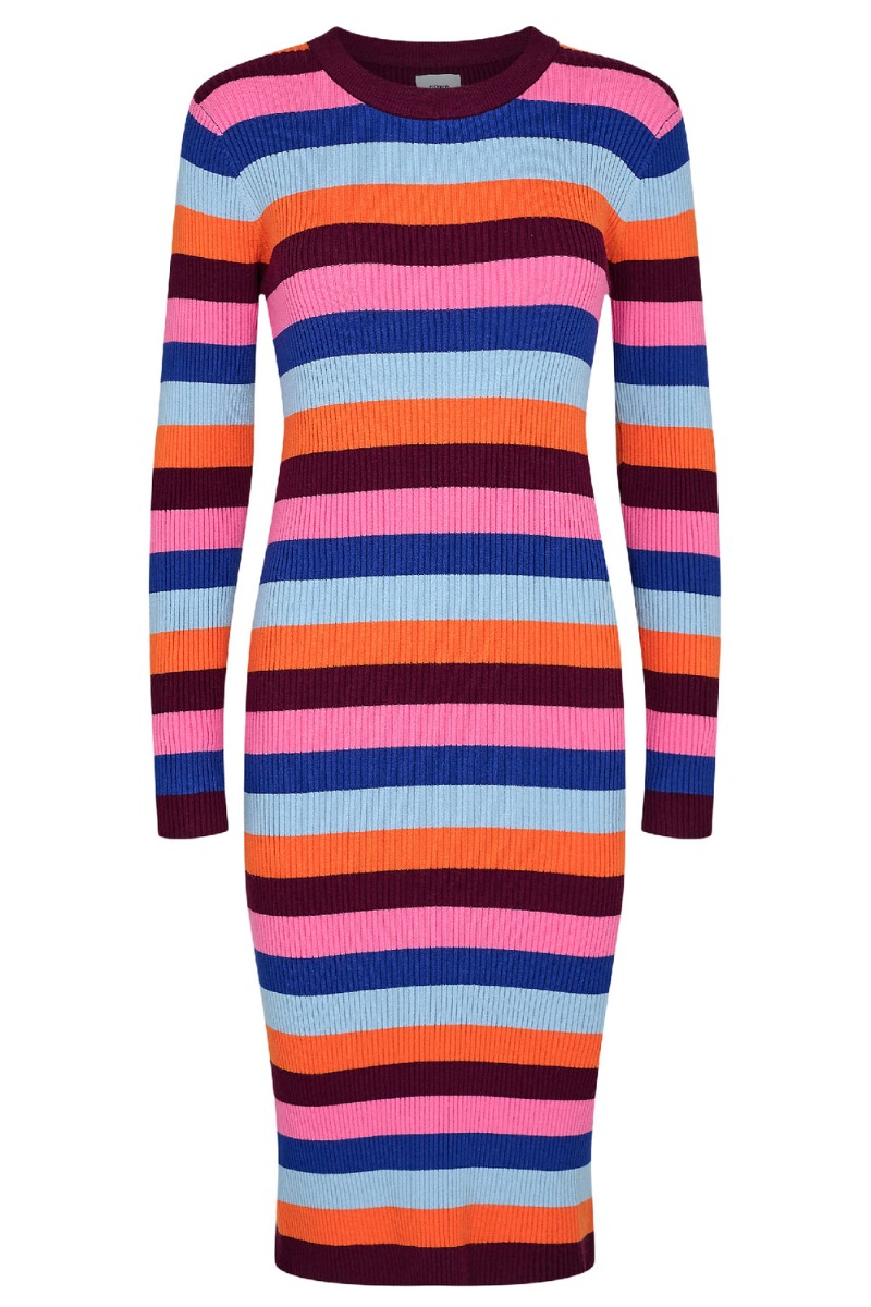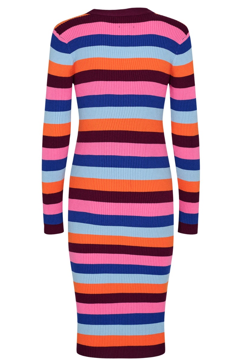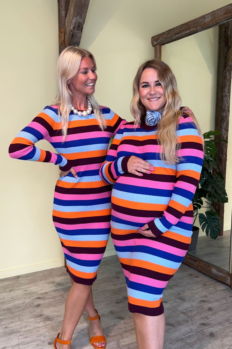 Wauw skøn kjole i rib strik med multifarvet striber fra Nümph. En tætsiddende kjole i et knælangt snit med rund halsudskæring, lange ærmer og en blød strækbar kvalitet. Perfekt til alle årstiderne og især perfekt hvis man render rundt med en smuk babybule.