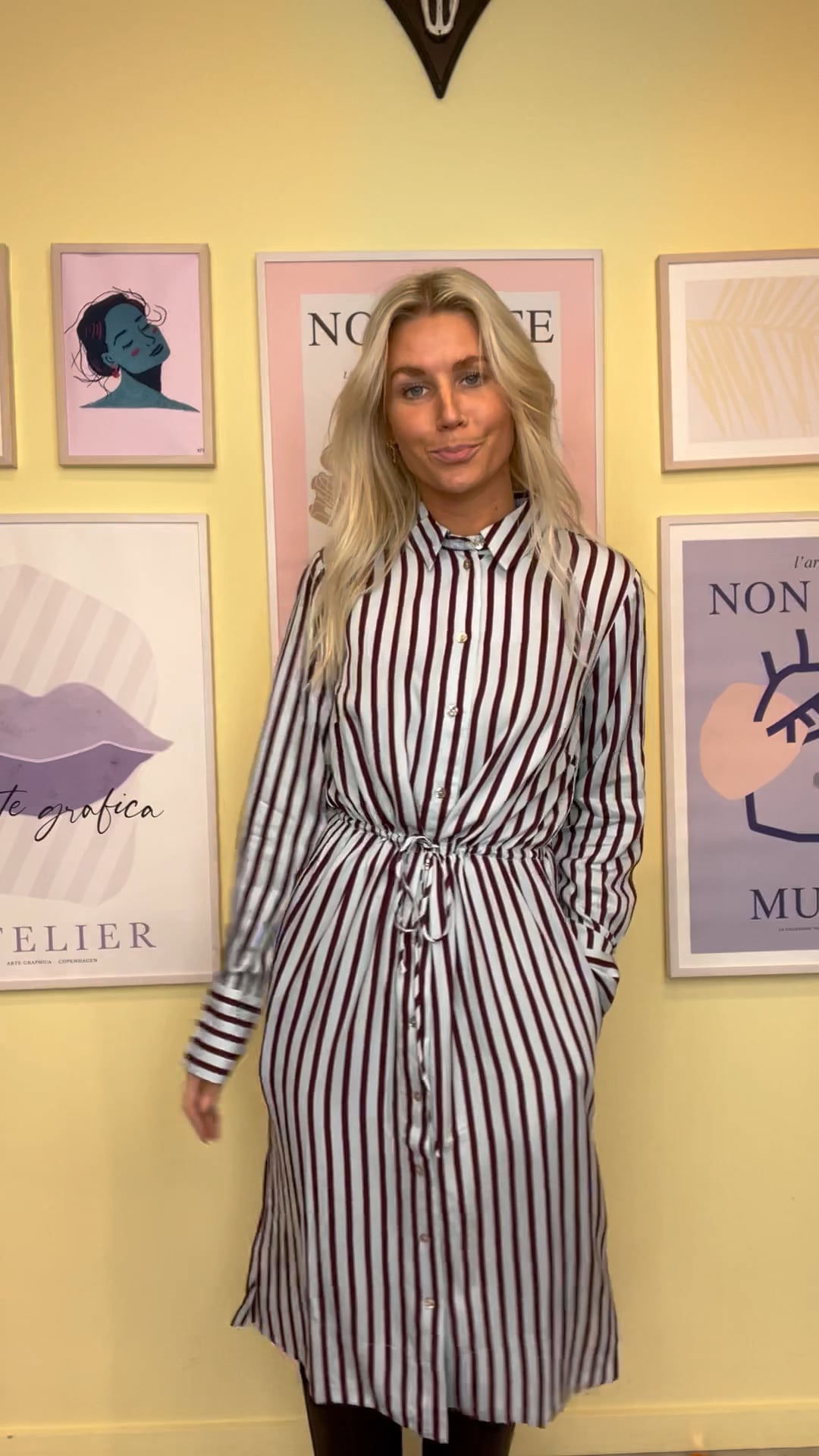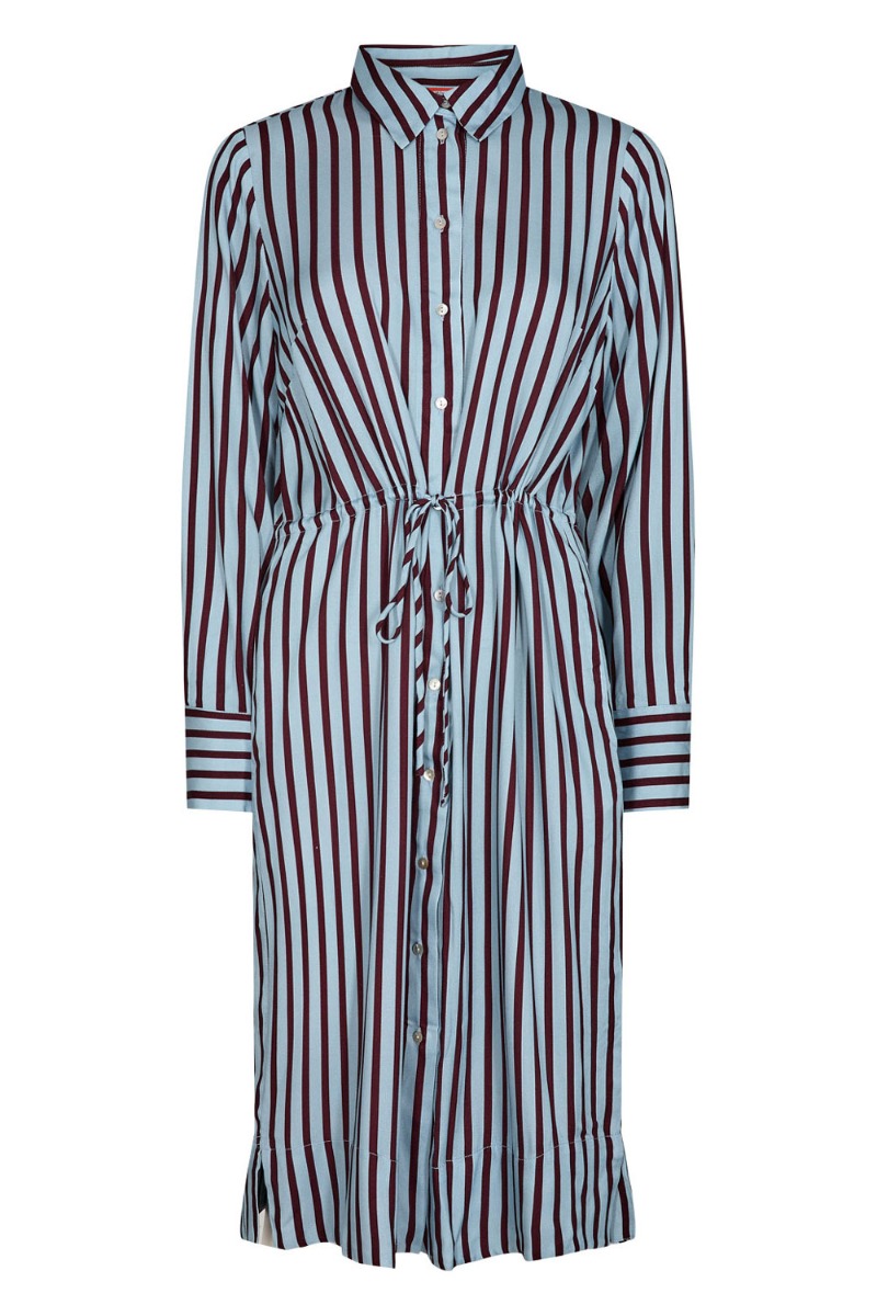 Den kjole er en perfekt hverdags kjole! Den er fra Nümph og er lyseblå med striber i bordeuax. Det er også en skjorteskjole som kan knappes ned og bruges som en kimono. Der er selvfølgelig bindebånd som sideder i taljen og kan spændes ing og ud alt efter hvor løs man vi have den til at sidde. Den er også ammevenlig og kan bruges i den tidlige graviditet.