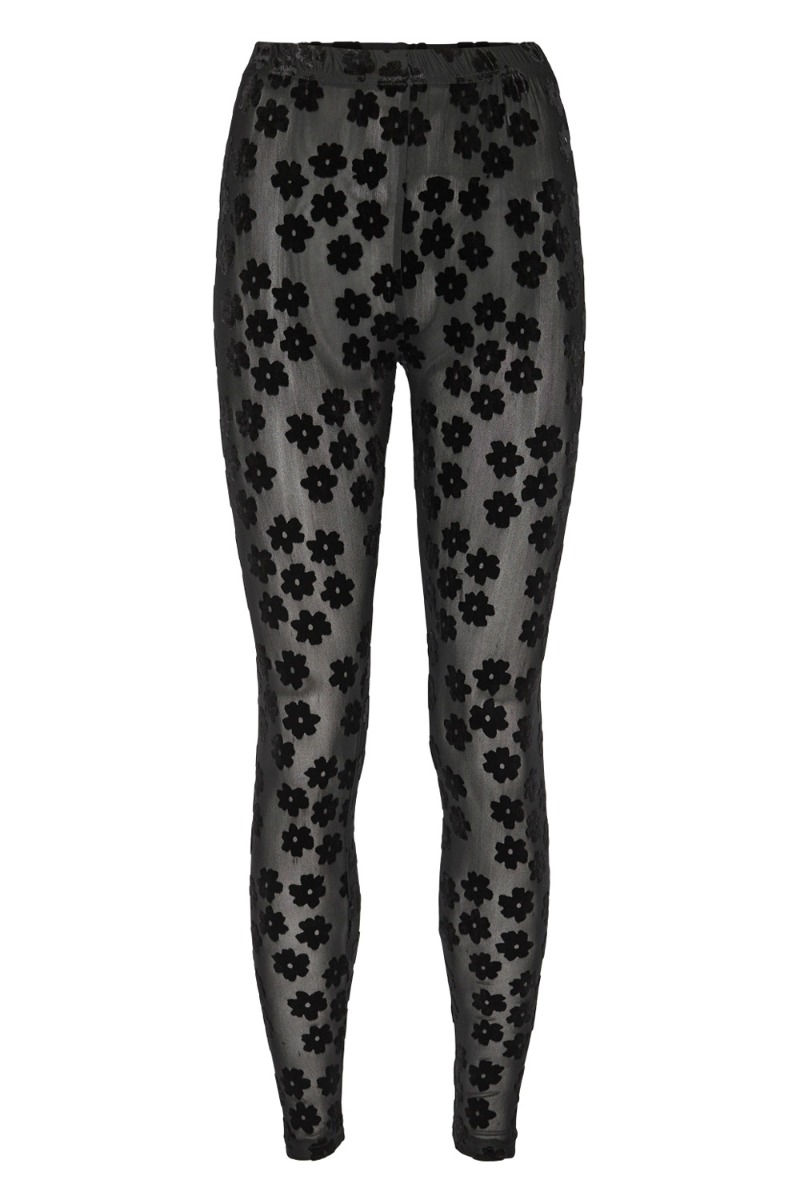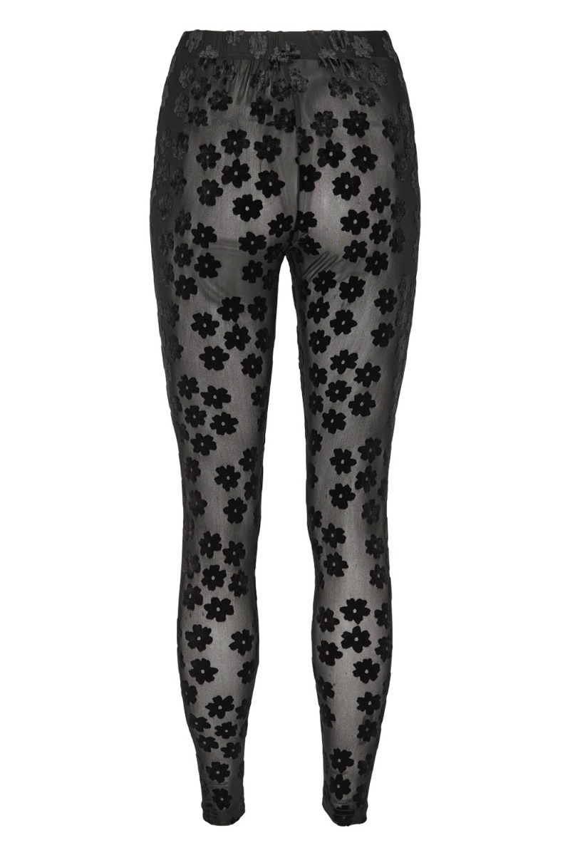 De fine leggings fra Nümph er tætsiddende i en let gennemsigtig kvalitet i mesh med sorte velour blomster der giver en skøn detalje. De har matchende bluse som kan bruges som sæt og ellers er de super seje at style under en oversize skjorte eller kjole.