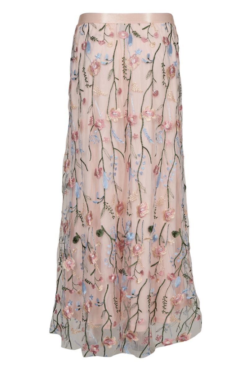 Smuk lang nederdel fra Nümph af. Denne nederdel er bare helt fantastisk smuk med den flotte blomsterprint i tyl med struktur og i e flot lyserød farve. Den har elastik i taljen og så sidder den løst og falder smukt. Der er et inderlag som stopper lidt før det yderste lag så man rigtig kan se at det yderste lag er fint og tyndt. Style den evt. med matchende top også fra Nümph.