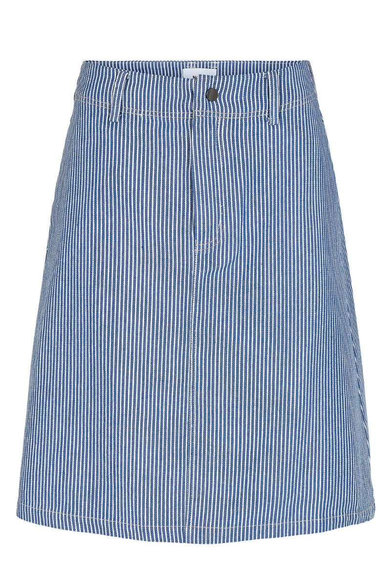 Stribet nederdel fra Nümph i hvid og blå. Nederdelen har en god mellem længde med fast linning der knappes foran og har bæltestropper. Den er super sød at style med en feminin skjorte eller almindelig t-shirt alt efter anledning.