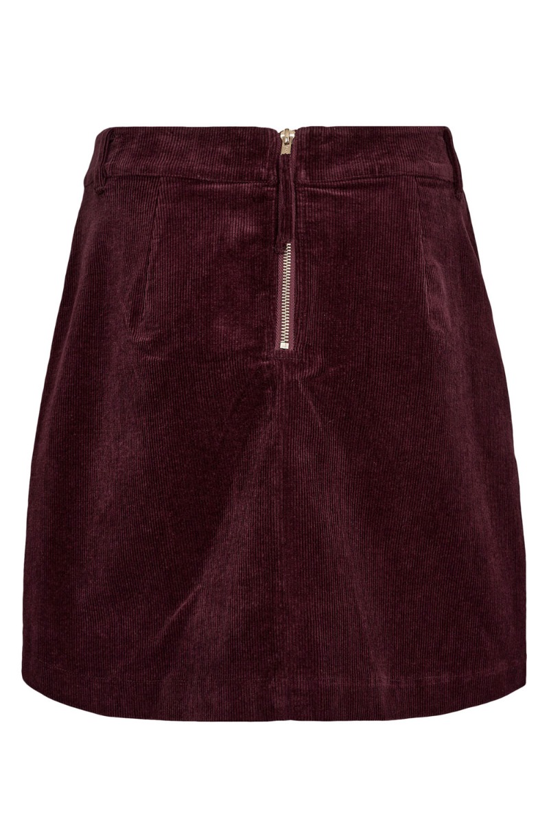 Den cool nederdel fra Nümph i bordeaux farvet fløjls materiale. Nederdeln har bæltestropper i taljen og lukkes med en lynlås bagpå som er guld farvet. Denne er tætsiddende og kort, derfor er den fin til en oversized skjorte eller t-shirt.