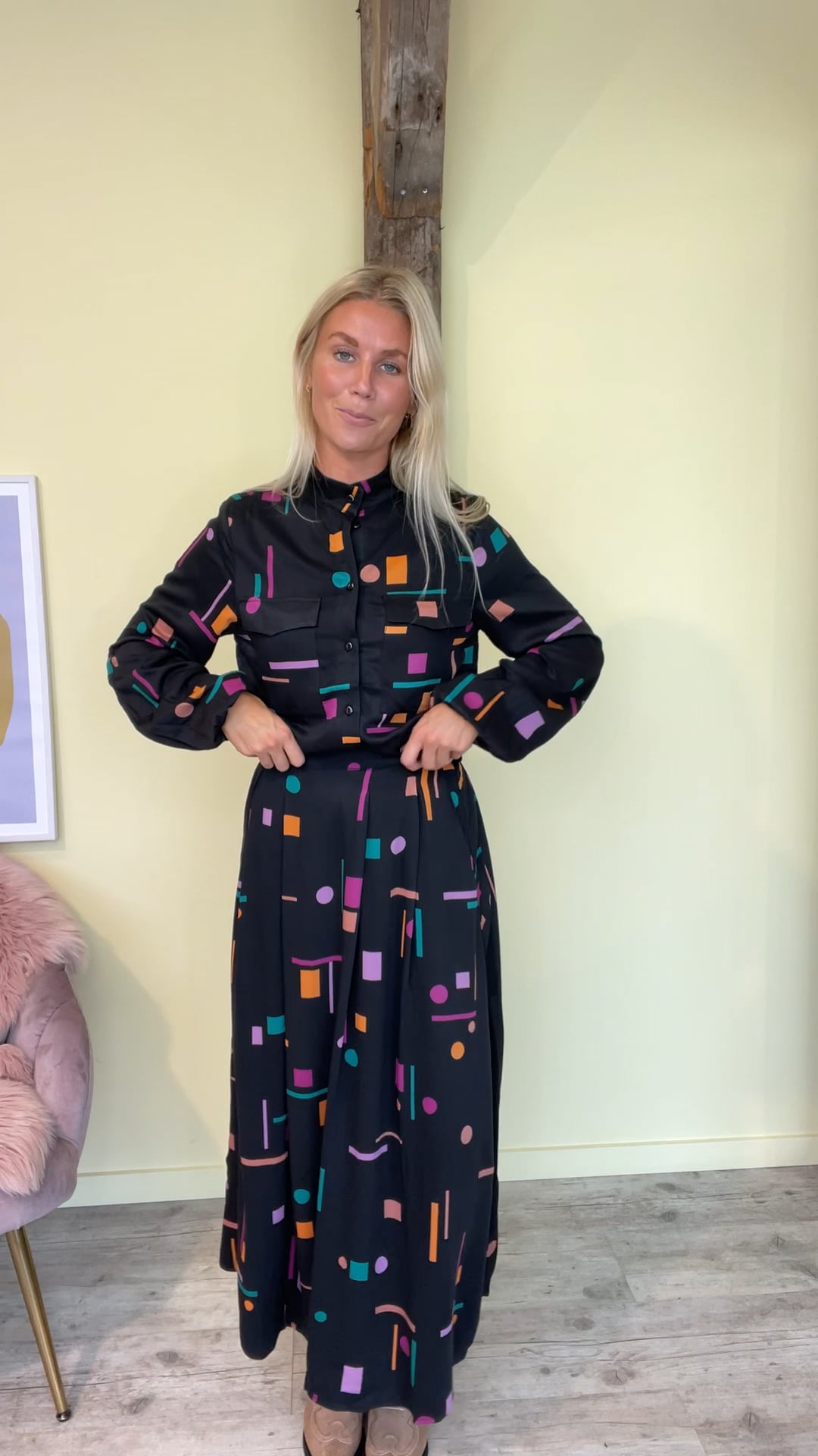 En lang nederdel fra Nümph i sort med printet mønster i flere farver. Nederdelen har elastik i taljen men ikke foran, derudover er der skrålommer foran. Snittet er A formet og dejlig løs i pasformen. Der findes et matchende skjorte til.