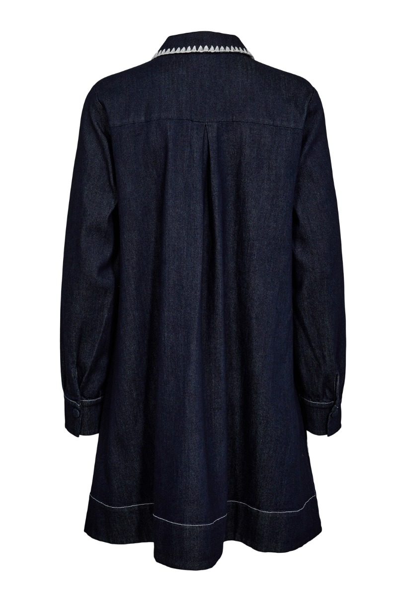 En virkelig fin kjole fra Nümph i en denimkvalitet. Denne kjole er i et A-snit, med lange ærmer og så har den en smuk krave. Denne kjole kan sagtens bruges til de koldere dage med et par strømpebukser og et par loafers eller en støvle!