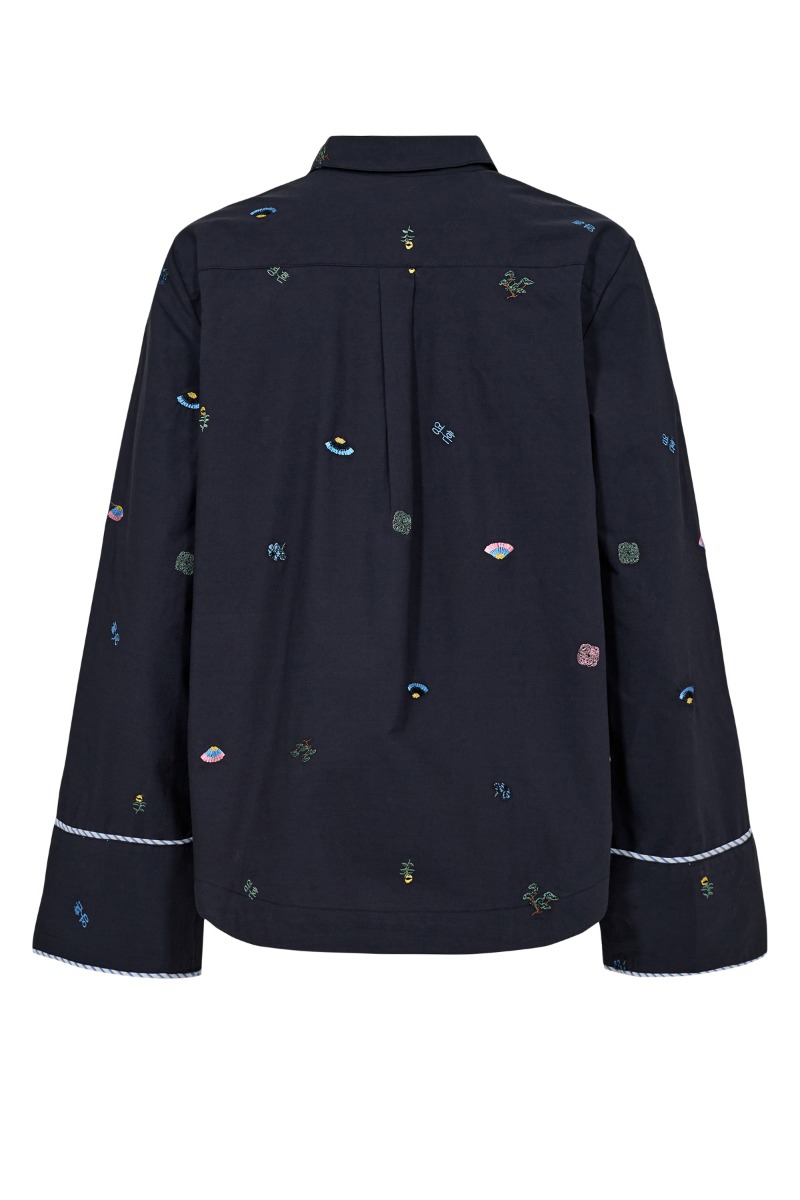 Boxy skjorte fra Nümph. Denne skjorte har en rummelig pasform og det fineste design! Skjorten har en mørkeblå baggrundsfarve med broderede objekter på. Den har brede ærmer, som giver et super cool udtryk. Style til et par jeans eller en enkel nederdel.