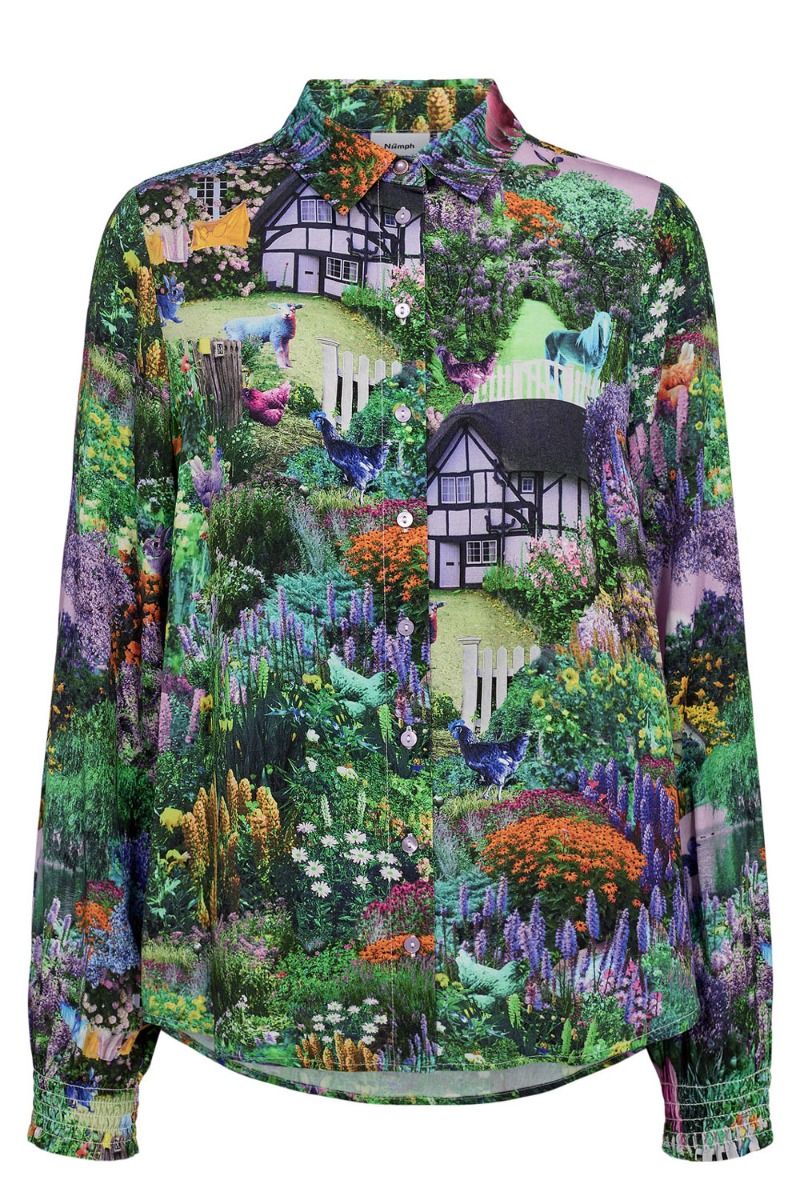 En feminin skjorte fra Nümph med det fineste personlige print på. Printet er fuld af blomster, farverige motiver og båndegårdstema - VI ELSKER DET! Den har et klassisk snit med knapper hele vejen ned foran og findes også som kjole.