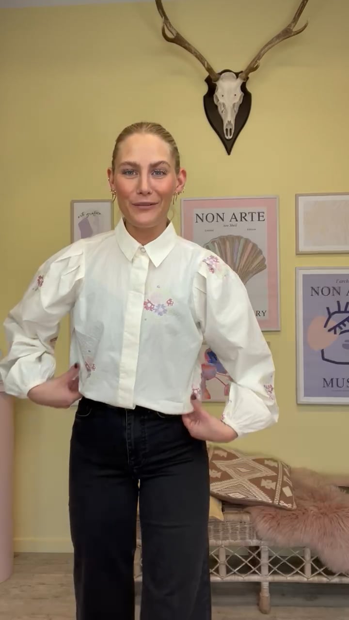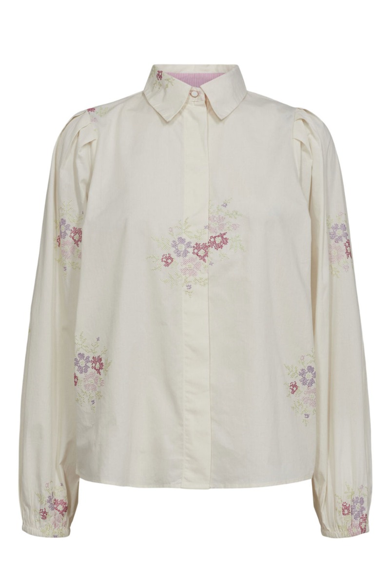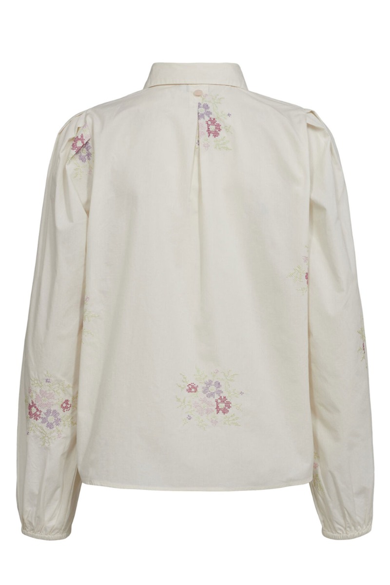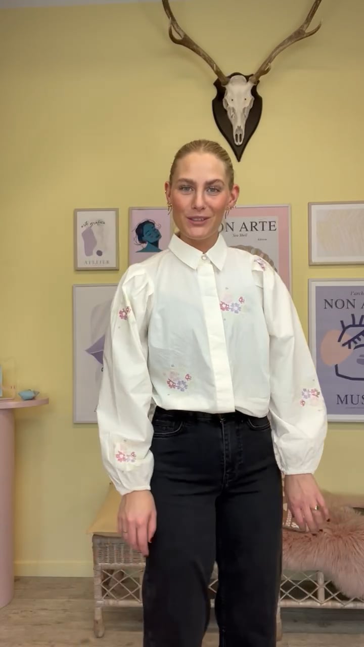 En fin skjorte fra Nümph er kommet i en hvid grundfarve med krydsbroderet små blomster. Den har skjult knaplukning foran og afsluttes ved halsen med en klassisk skjortekrave. Ved ærmerne er der sat en smal elastikkant i bunden, så det giver en smule balloneffekt. En fin hverdags skjorte til en simpel underdel.