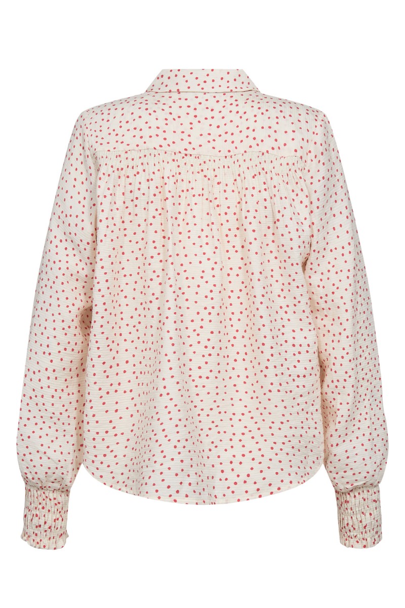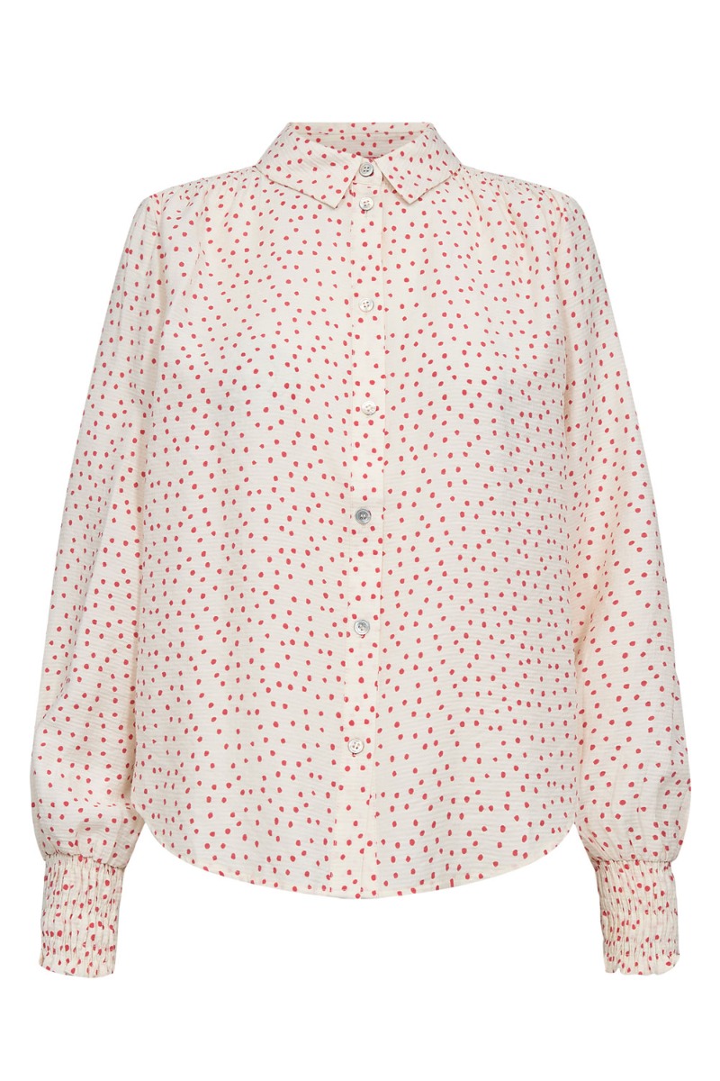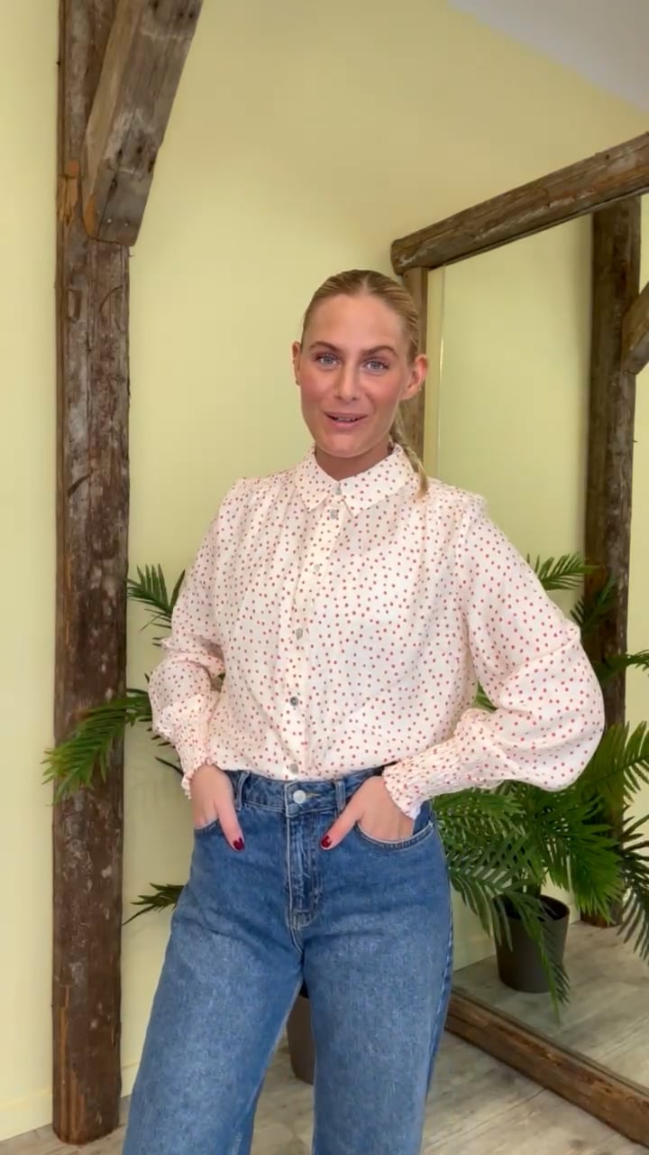 En fin skjorte fra Nümph i hvis med små røde printet. Den er fra Nümph er i en dejlig let kvalitet. Derudover er den med smockeffekt i bunden af begge ærmer så den danner denne lille balloneffekt. Den kan nemt styles til både jeans og nederdel.