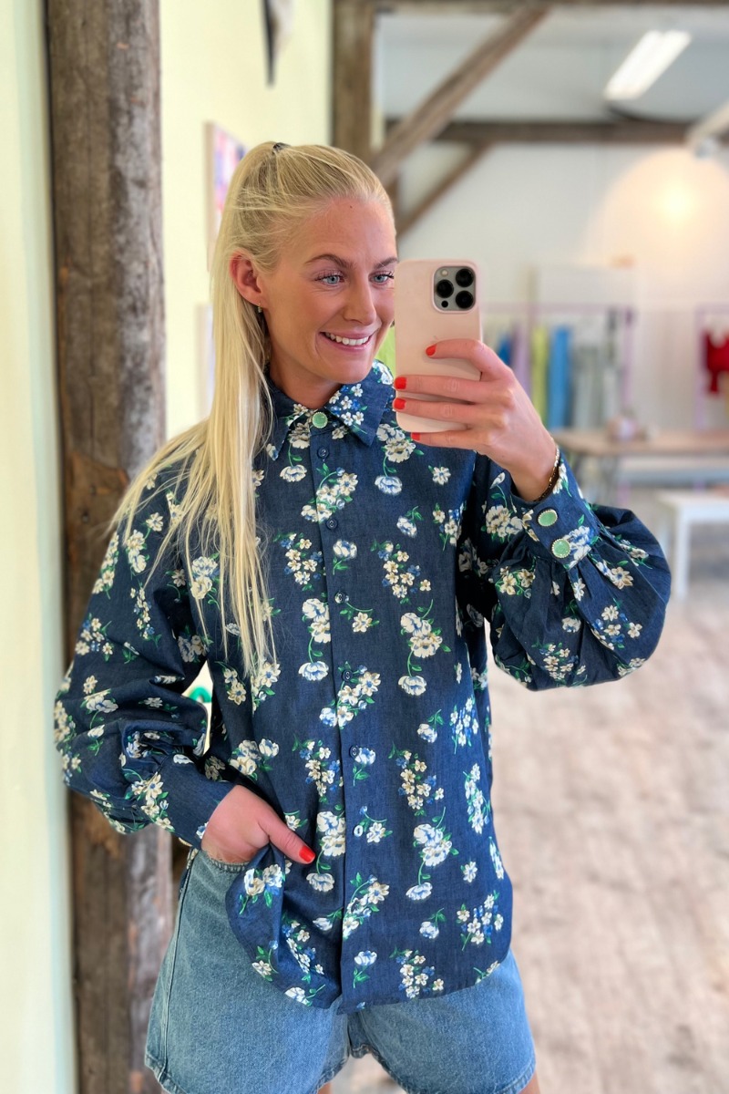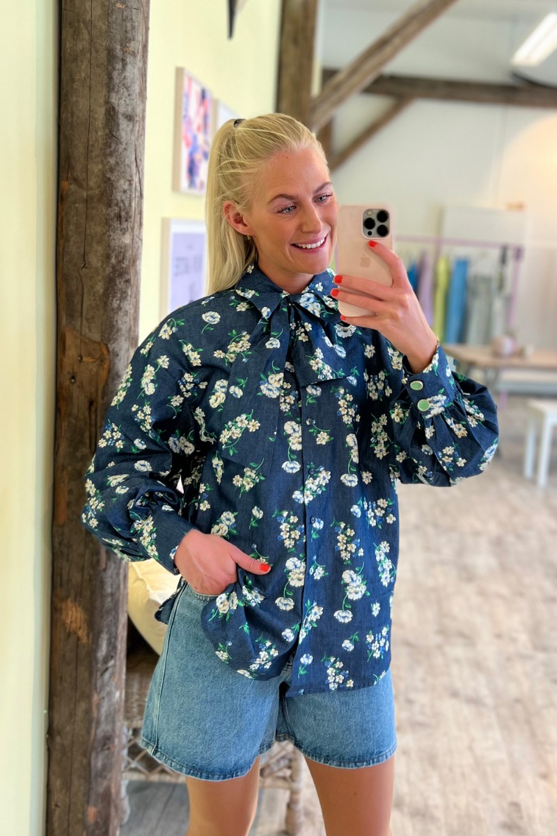 Smuk skjorte fra Nümph med det fineste blomsterprint. Nümph har altid være gode til print og her er ingen undtagelse. Bundfarvet er en klassisk denim farve med smukke hvide blomster printet på. Selvom farven er denim, så er kvaliteten helt let og blød og har de sødeste knapper i mintgrøn som afslutning ved ærmerne og ved halsen. Der er et bånd med som kan sættes rundt om halsen og bindes til en sløjfe og give et feminint udtryk. Men skjorten kan også sagtens bruges uden.