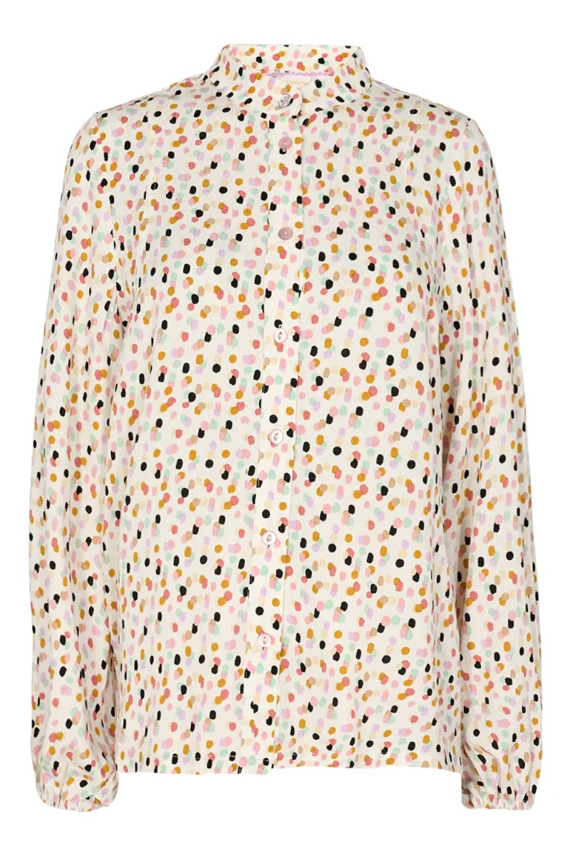 Super sød cremehvid skjorte fra Nümph. Skjorten er pyntet med de fineste små multifarvet bomber som giver et frisk og sødt udtryk på skjorten. Den har et løstsiddende snit med lange løse ballonærmer som afsluttes med elastikkant. Den har små lyserøde knapper hele vejen ned og lukkes i toppen med en lyserød skinnende knap. Styl den til et par farverige bukser eller et par klassiske denim jeans.