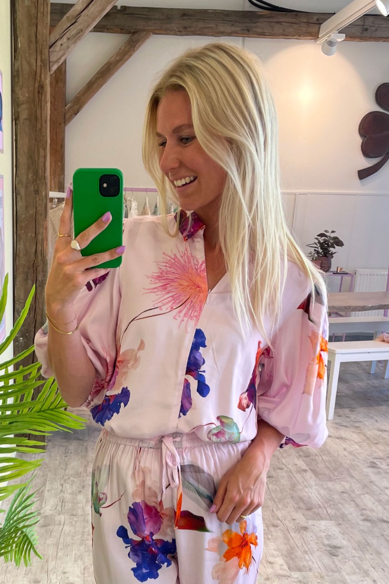 Wauw se lige det smukkeste blomsterprint fra Nümph! En skøn lyserød skjorte med det flotteste multifarvet blomsteprint. Skjorten har en løstsiddende pasform med 3/4 ærmer med elastikkant. Foran har den en klassisk skjortekrave med lynlås ved halsudskæringen som kan justeres efter eget ønske og ammes i. For et fuldendt look er det oplagt at style skjorten til de matchende bukser.