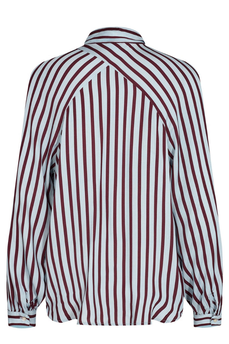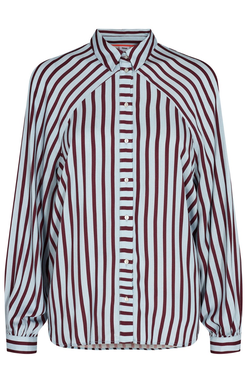 En cool skjorte med striber i bordeaux og lyseblå. Den er fra Nümph har den fine logo i nakken samt en løs pasform. Den er kort i modellen og derfor perfekt til et par bukser. Knaplukningen er synlig og ærmerne har en smule balloneffekt. Derudover er kvaliteten helt let og behagelig at have på.