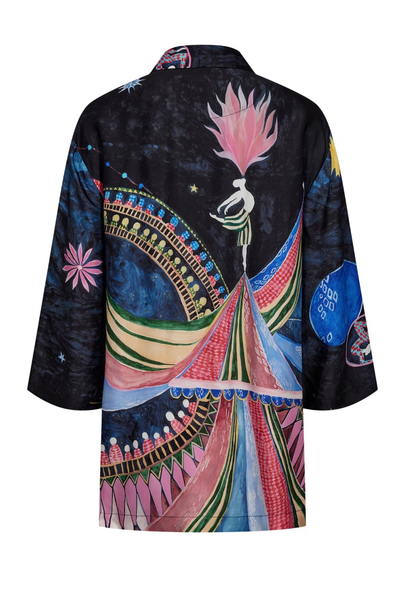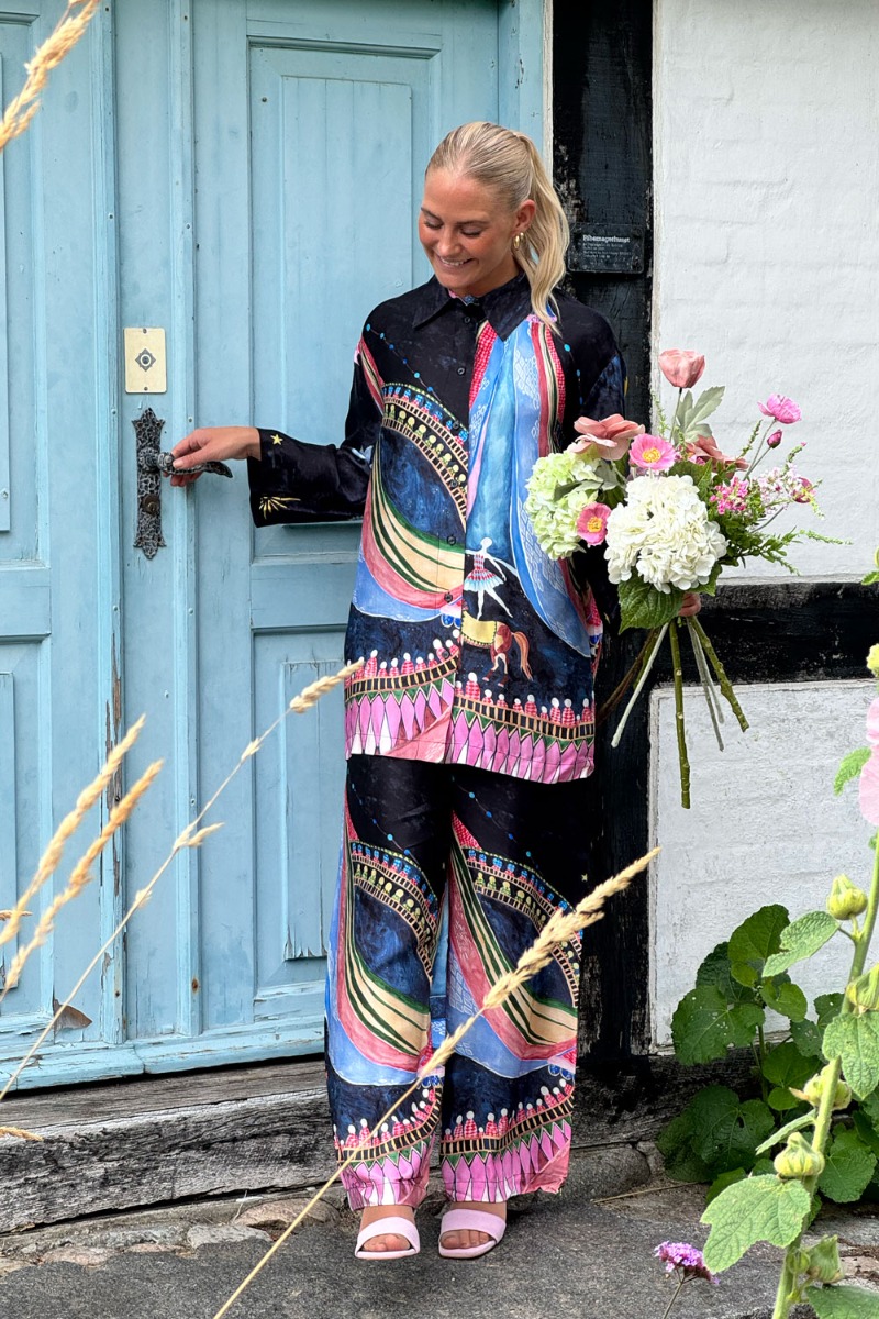 Flot lang skjorte fra Nümph. Skjorten er lavet i det smukkeste print, som giver en helt magisk og drømmende fornemmelse når man kigger på det. Der er masser af fine detaljer gemt i printet. Skjorten er en lang model og har brede 3/4 ærmer. På wepshoppen kan du finde matchende bukser i samme print, og en kjole.