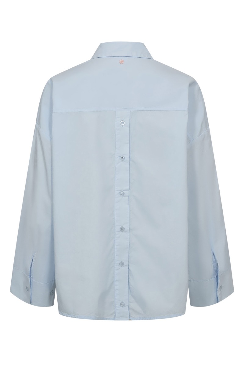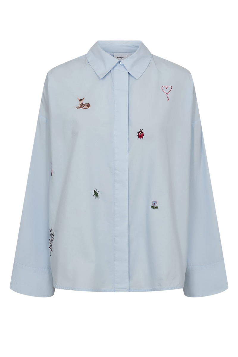 Denne lyseblå skjorte har et klassisk og stilrent udtryk med en moderne, afslappet pasform og brede manchetter, der giver et cool og tidløst look. Skjorten har klassisk krave og skjult knaplukning foran, som understreger det enkle design, mens de små broderede motiver på fronten tilfører et legende og personligt twist. Her ses blandt andet et hjerte, en mariehøne, en lille blomst, en bille, en gren samt en lille hjort, som giver skjorten et fint og feminint udtryk. Bagsiden er mere enkel med en ren silhuet og knapdetalje langs ryggen, der fuldender det afslappede look. Perfekt at style med jeans eller habitbukser for et moderne outfit med søde detaljer.