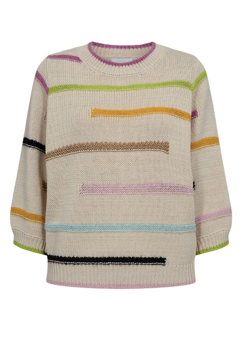 En skøn strik fra Nümph er kommet med striber i forskellige farver. Den er løs i pasformen og har 4/3 lange ærmer. Den afsluttes med ribkant ved hals, ærmer og bund. Den kan nemt styles til et par jeans eller til en nederdel. Brug den også gerne over en stram top som kan titte frem ved ærmerne.