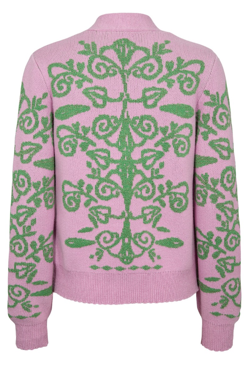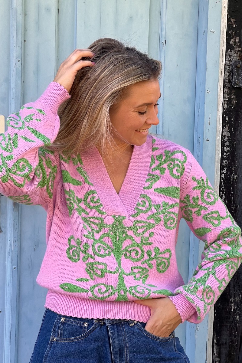 En smuk pullover i en let kvalitet fra Nümph er kommet i denne lilla farve med grønt mønster. Nümph er altid god til print og her er der ingen undtagelse. Den er nem til hverdag med et par jeans og kan sagtesn bruges til nederdel også. Den fin v hals gør at den syner mere let i udtrykket og den lette kvalitet gør den behagelig at have på hele dagen.