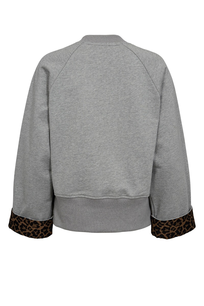 En fin sweatshirt fra Nümph er landet i en klassisk lysegrå og med det sejeste leopardprint på de opsmøgede ærmer! Sweatshirten har en dejlig løs og rummelig pasform, så den er altså maks behagelig!