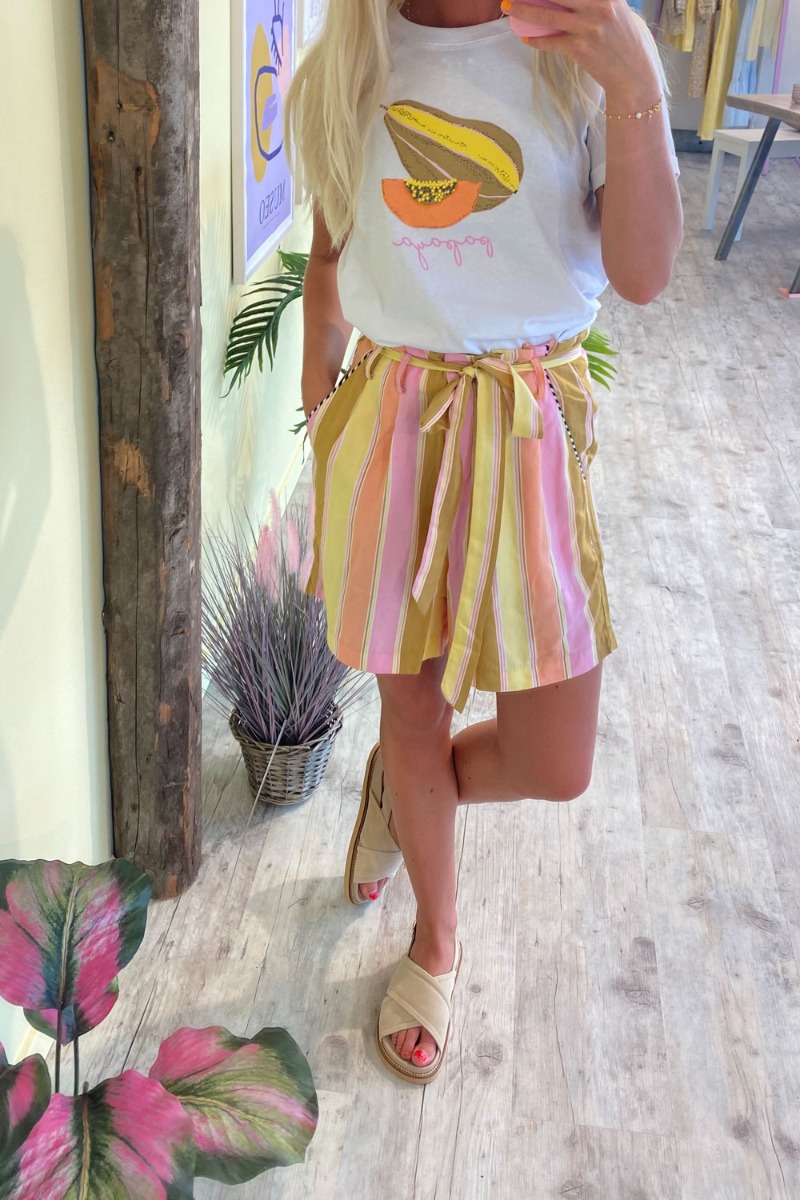 Enkel t-shirt fra Nümph i hvid med et lille frugt print på brystet. T-shirten har et klassisk look med rund hals og korte t-shirtærmer. Den er super sød at style til et par shorts eller jeans til hverdag.