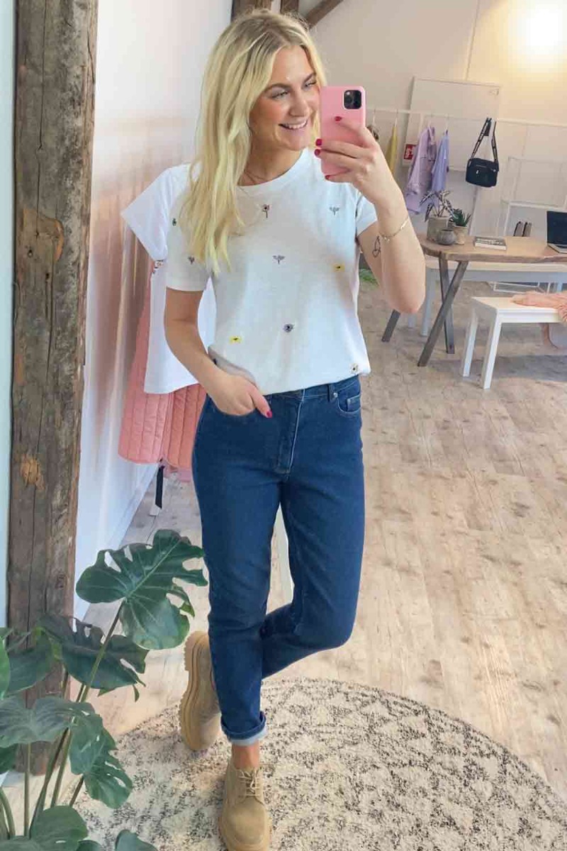 Klassisk hvid t-shirt med broderi blomster i forskellige nuancer. T-shirten har en klassisk løs pasform med rund halsudskæring. Style t-shirten til denim jeans eller nederdel.